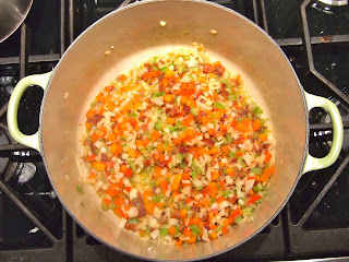 1. Heat the olive oil in a heavy-bottomed soup pot. Add the onion, carrot, coriander seeds, cumin seeds, Chile powder, turmeric, Chile flakes, salt, and pepper and cook, stirring often, over medium heat.