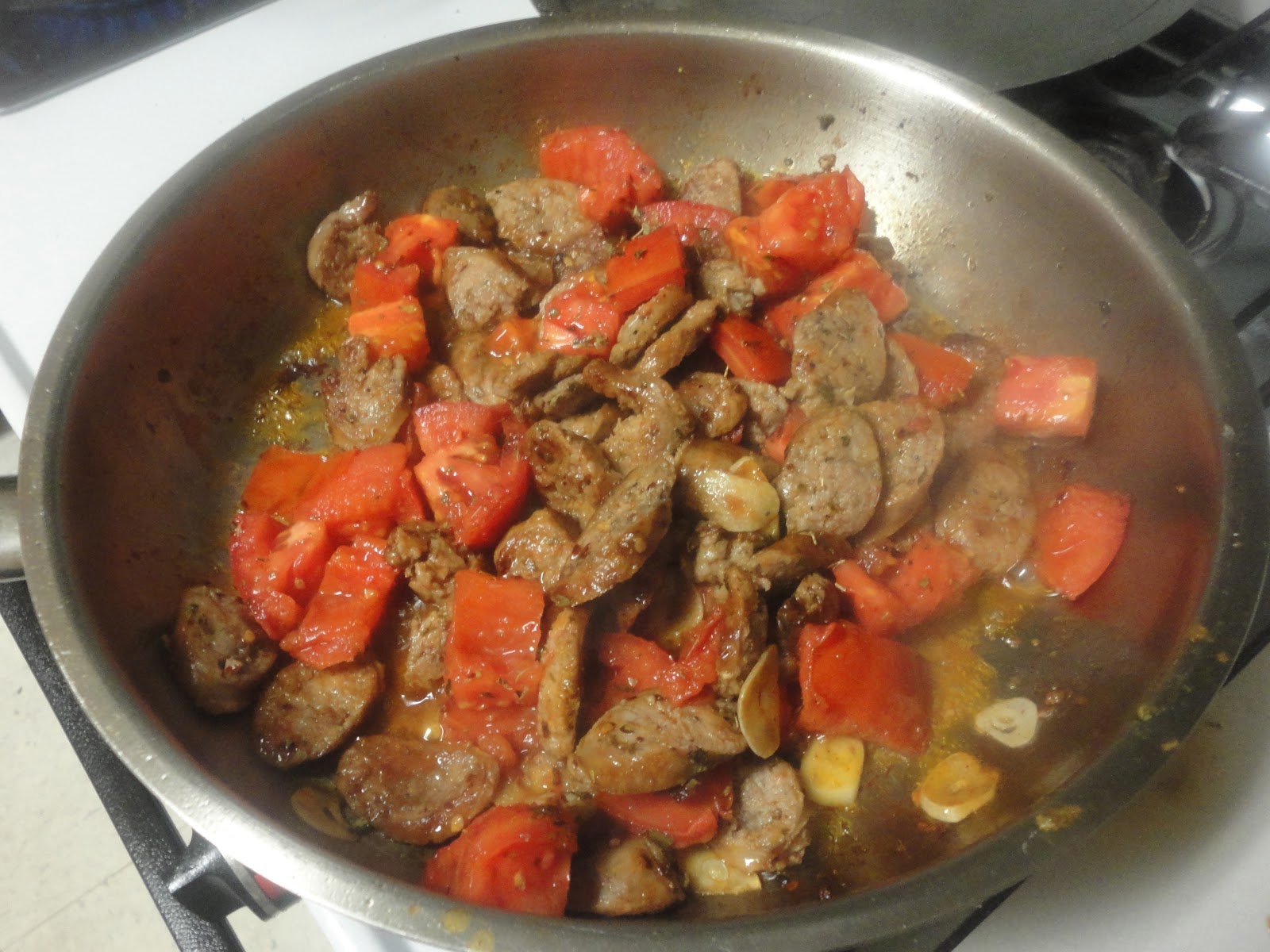 3. Cut them into thin slices, return to the skillet and cook until they start to brown. Add the garlic and sauté briefly, then add the tomatoes, pepper flakes and oregano and cook for a few minutes. Do not allow the tomatoes to break down; they should remain in chunks.