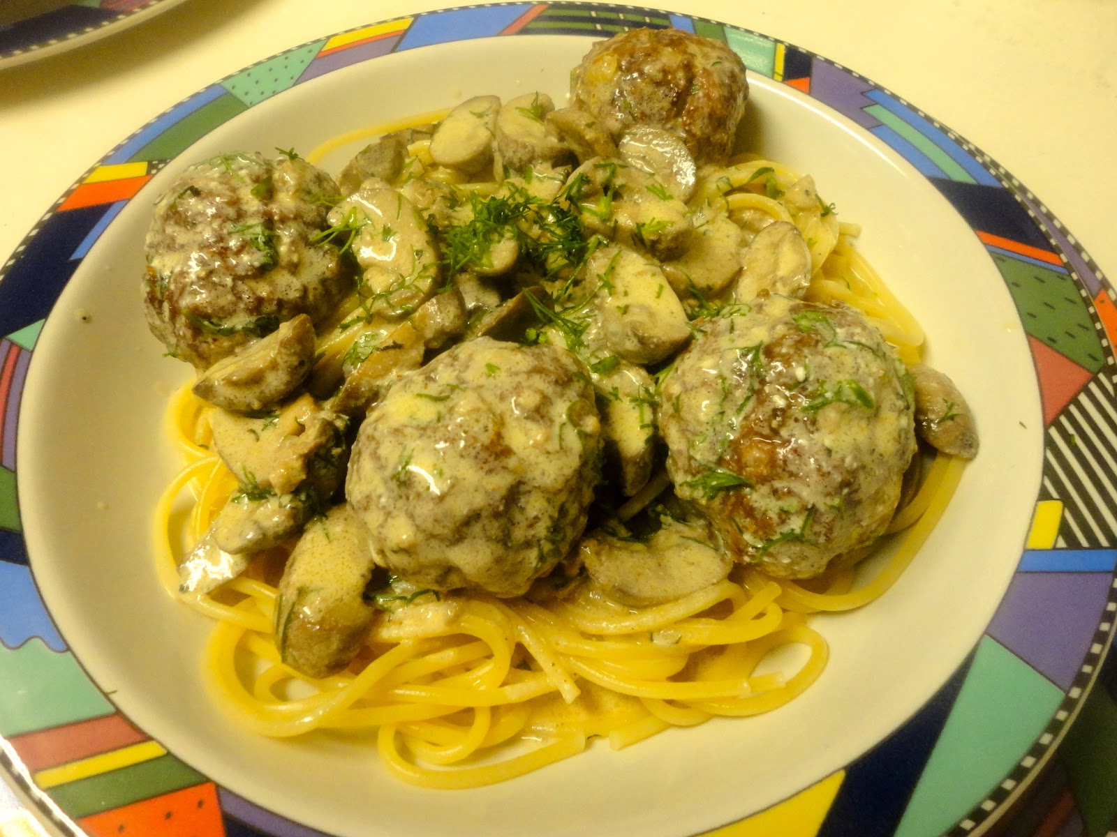 I don’t think it constitutes a trend but two of my food magazines published recipes for basically the same dish this month.  The magazines in question hardly rival Gourmet.  “Martha Stewart’s Everyday Food” is geared to the home cook and one who generally doesn’t like even the mildest surprises when they cook.  “Cuisine-at-Home” comes with 3 hole punches on every page so you can build your own cookbook with their pretty basic recipes. These are not generally go-to resources for me:  I prefer to be more adventurous and at least challenge myself with new flavors and cooking styles. But somehow, I cannot resist a new take on meatballs.  And Beef Stroganoff is one of my favorites from way back. Calling as it does for fillet of beef however has dimmed my enthusiasm. With the price of beef fillet approaching the stratosphere, if I am going to cook one, I am not about to cover it in sour cream.  Not too long ago, I made a version using sirloin, which is about the best buy in beef I can find—at least here in New York.   What a disappointment that was!  Way too tough!  But the dueling photos in the two magazines really did appeal to me.  Topping egg noodles in one and spaghetti in the other, they were just the kind of comfort I was looking for. And in Chinese menu fashion, I made the dish with the meatballs from one and the Stroganoff from the other.
