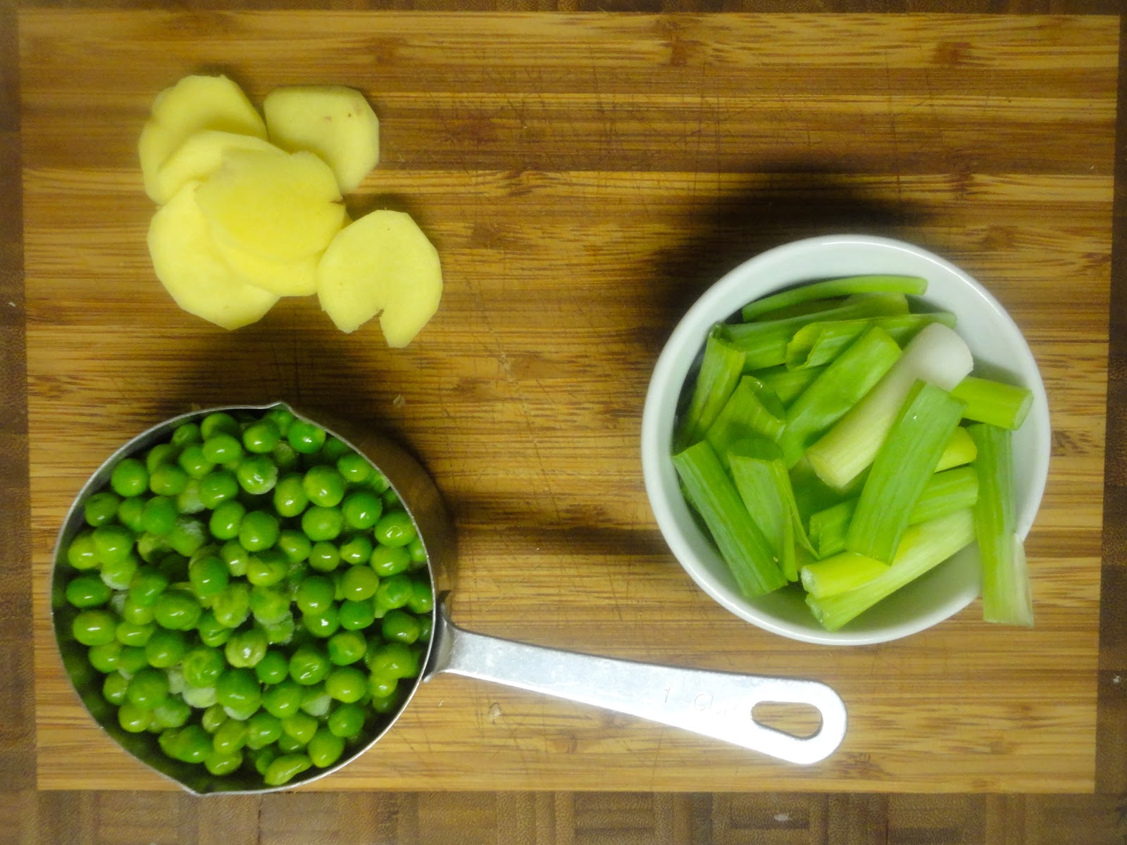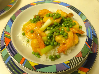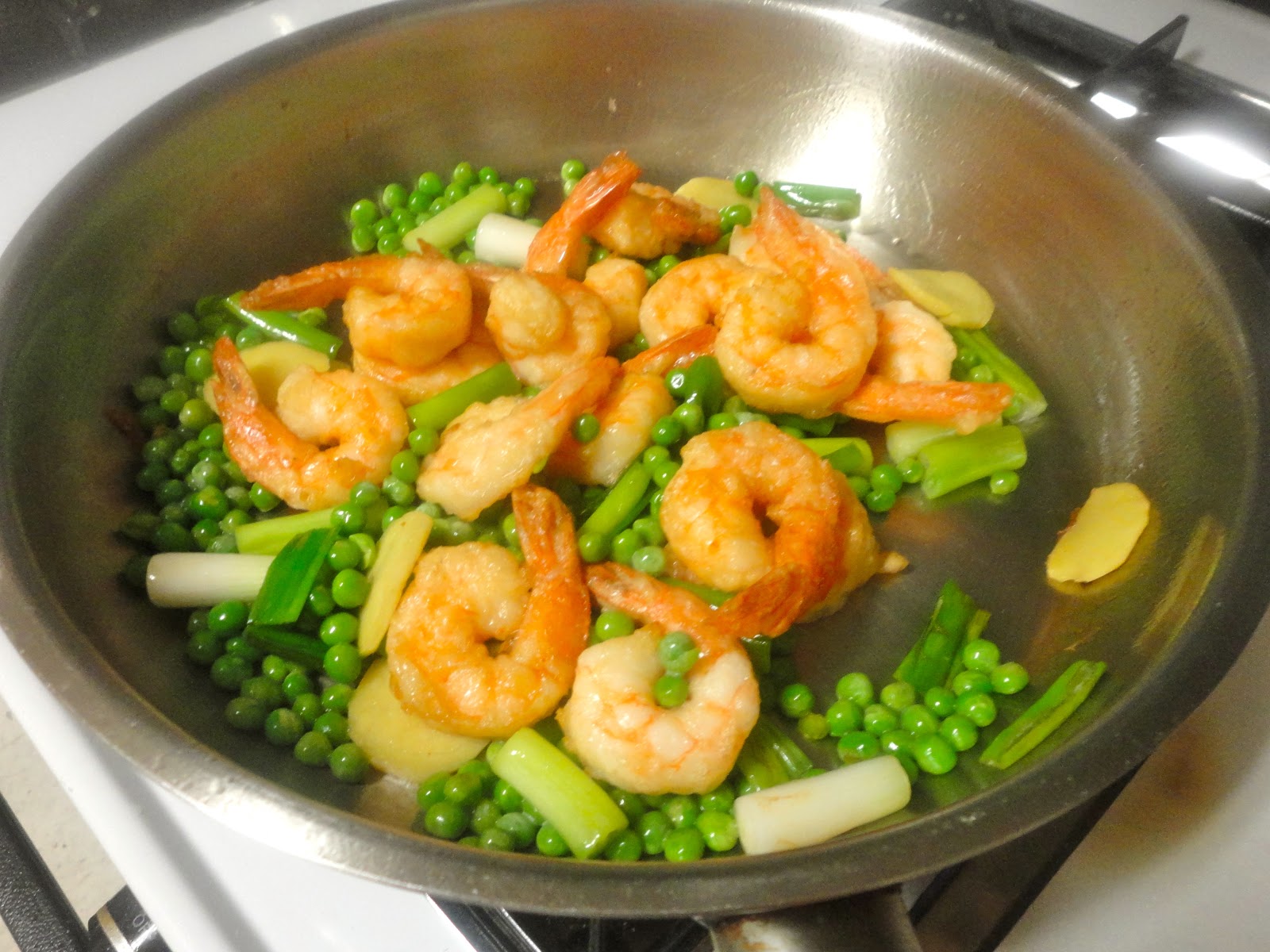 Recipe for Crystal Shrimp with Ginger, Sweet Peas and Scallions adapted from Bon Appetit
