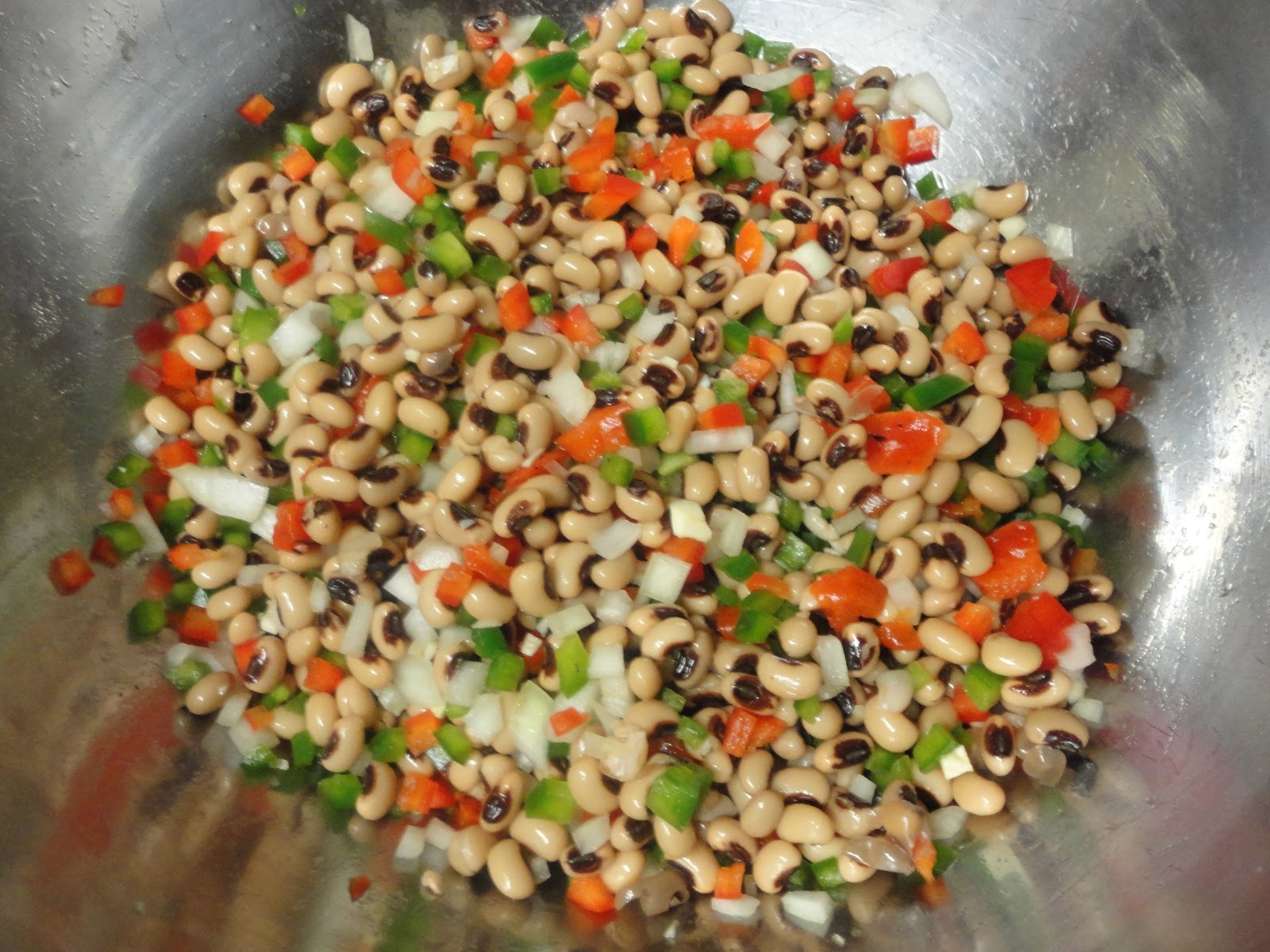 Combine peas, bell peppers, hot peppers, onion, pimento and garlic.