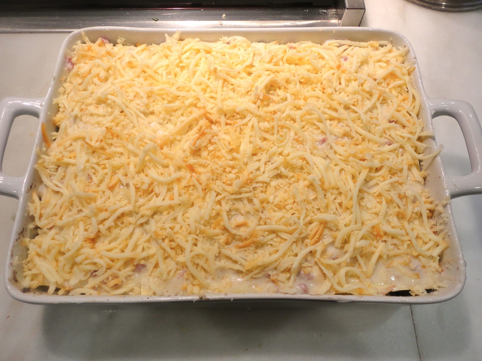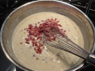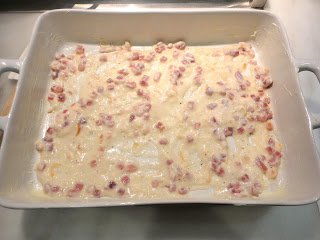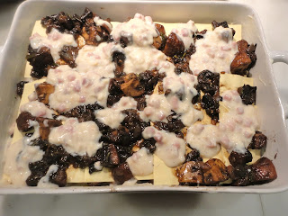 Today’s version is a wonderfully rich pasta with layers of creamy béchamel, peppery mushrooms, smoky cheese and tiny pieces of prosciutto. It’s so rich, you may want to practice some portion control when you serve it. If you have leftovers, reheated in the oven, they too keep for a very long time and can easily make a quick meal anytime you need one. Now I’ve made classic lasagna for years sharing it with you in its most classic of recipes: http://chewingthefat.us.com/2010/02/lasagna-verdi-al-forno.html We’ve also gone totally vegetarian with one version: http://chewingthefat.us.com/2011/09/vegetarian-lasagna-adapted-from-saveurs.html. But this lasagna straddles the line with its emphasis on meaty mushrooms and the secondary role the prosciutto takes. What really comes to the fore is the use of smoked Mozzarella. It changes the character of the whole dish.