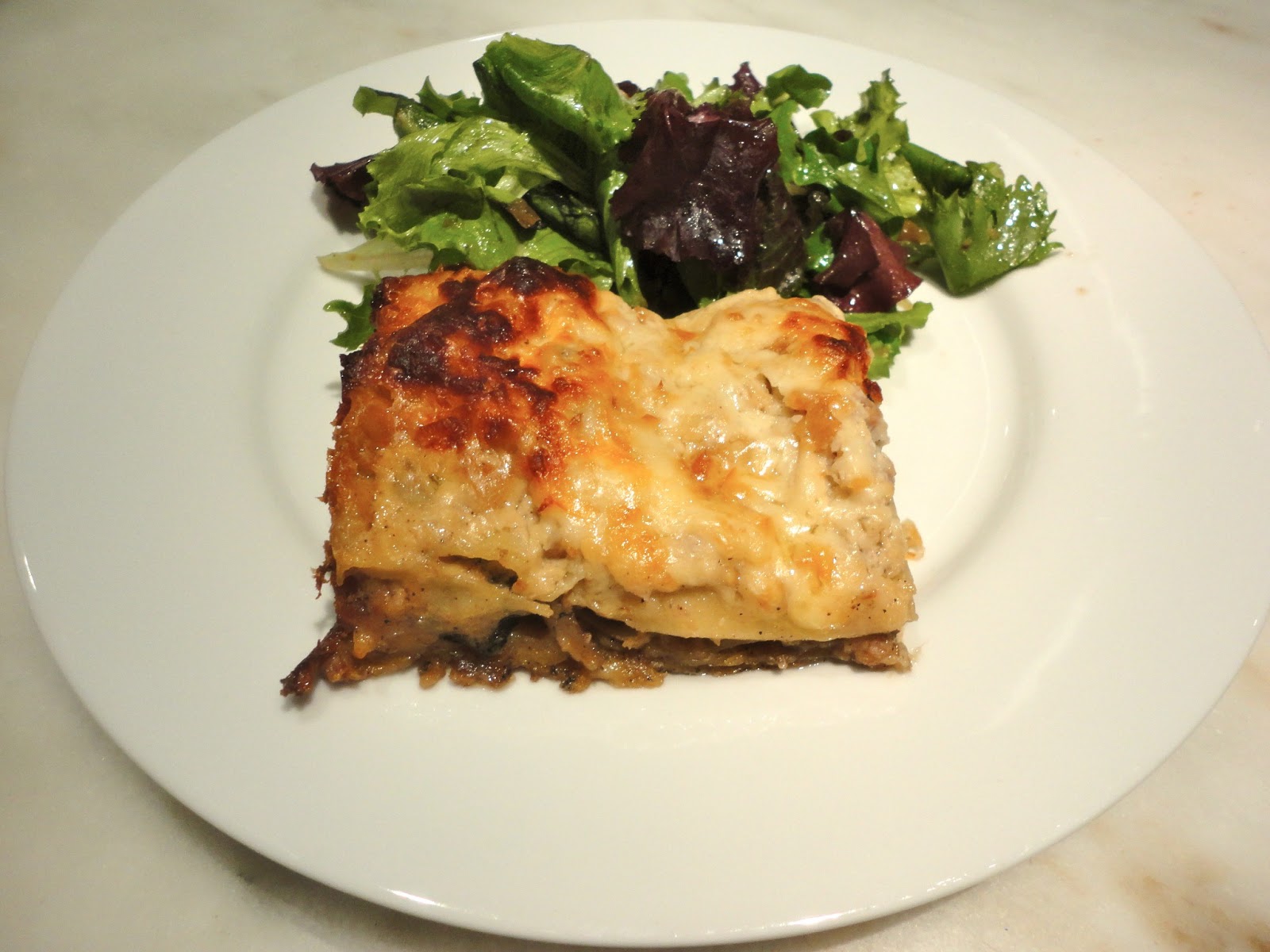 But if you go to the trouble of making a simple béchamel sauce with cheese, making a filling of meat sauce or vegetables you are on your way to real lasagna. Made up in advance, its flavors meld into each other with the passage of a couple of days. Kept sealed until plastic wrap topped with a layer of aluminum foil, this lasagna spent a whole week in the fridge before being baked on a night when we had a lot going on. Nothing could have been easier than firing up the oven, baking the lasagna for 40 minutes, tossing a green salad then sitting down to dinner.