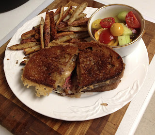 Patty Melts are not all that complicated to cook. Follow these directions and you’re on your way. The trick here is to work with two skillets. One where you will cook the beef patty and the second where you will prepare the slices of cheese and onion covered rye bread. That way you avoid the perilous task of flipping the Patty Melt. Instead you simply put the beef patty in at the last minute and your Melt is made. To elevate the sandwich to celestial standards, find the best rye bread you can and use it. Supermarket sliced rye hasn’t got a patch on the a loaf of seeded rye from an artisanal baker. You have a little flexibility on the size and thickness of the patty. Tiny’s recipe calls for 5 oz. of 80 percent lean, 20 percent fat ground chuck. I went for 8 oz. per serving, largely because my Trader Joe’s beef comes packed in 1 lb. lots. Remember not to handle the beef anymore than is necessary to form it into a oval patty. Like meatloaf, the less you handle it, the better your results will be. I served the patty melt with some Oven Fries and a Cucumber and Tomato salad. The salad added some color to the plate and made us feel far less guilty for eating this amazingly satisfying once-in-a-very-long-while treat. Here’s the recipe from Tiny Naylor himself.