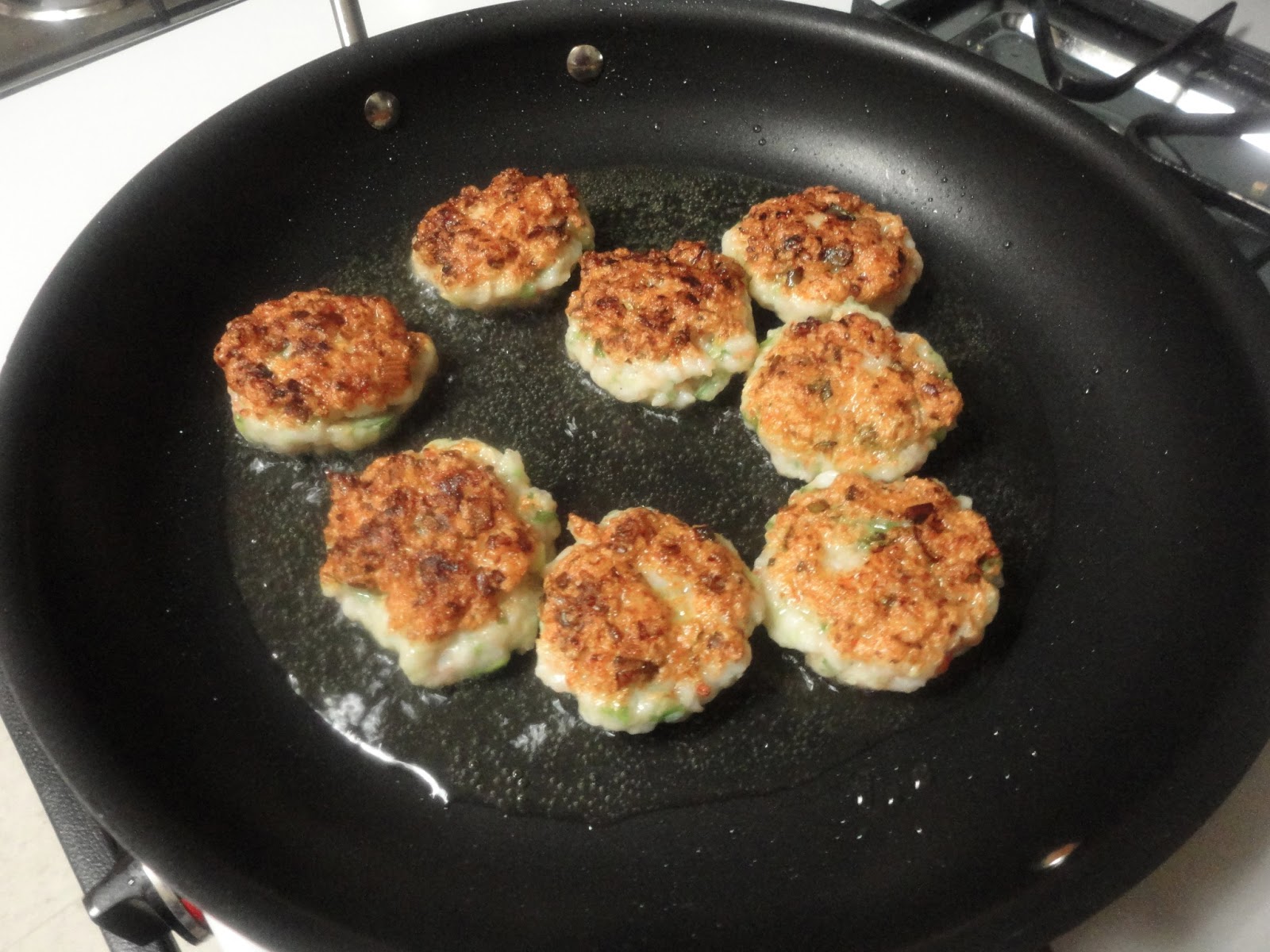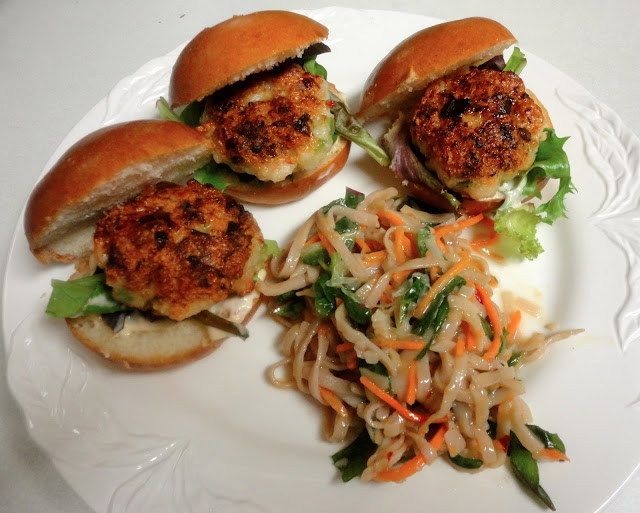 The whole dish comes together very quickly.A food processor makes that happen. If you are serving them to kids, turn down the heat by leaving out the serranos or jalapenos in the shrimp paste. If you have a little extra time, after you’ve processed the paste, refrigerate it. This will make forming the shrimp cakes easier. While the paste chills, you can make the Nuoc Cham and the Nuoc Cham mayonnaise. Now go back to making the patties. Run your hands under cold water to make that easier. Fry them in a bit of oil and you’re done. Served with a side of cole slaw or rice slaw, these crunchy golden beauties are a perfect match to the softness of the Brioche buns. Here is the recipe: