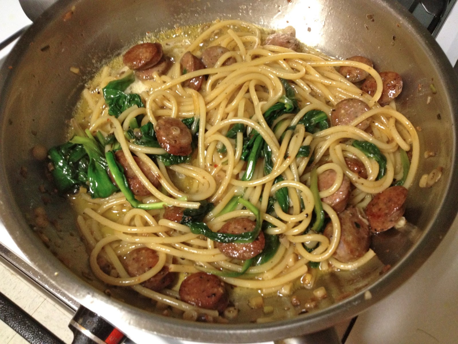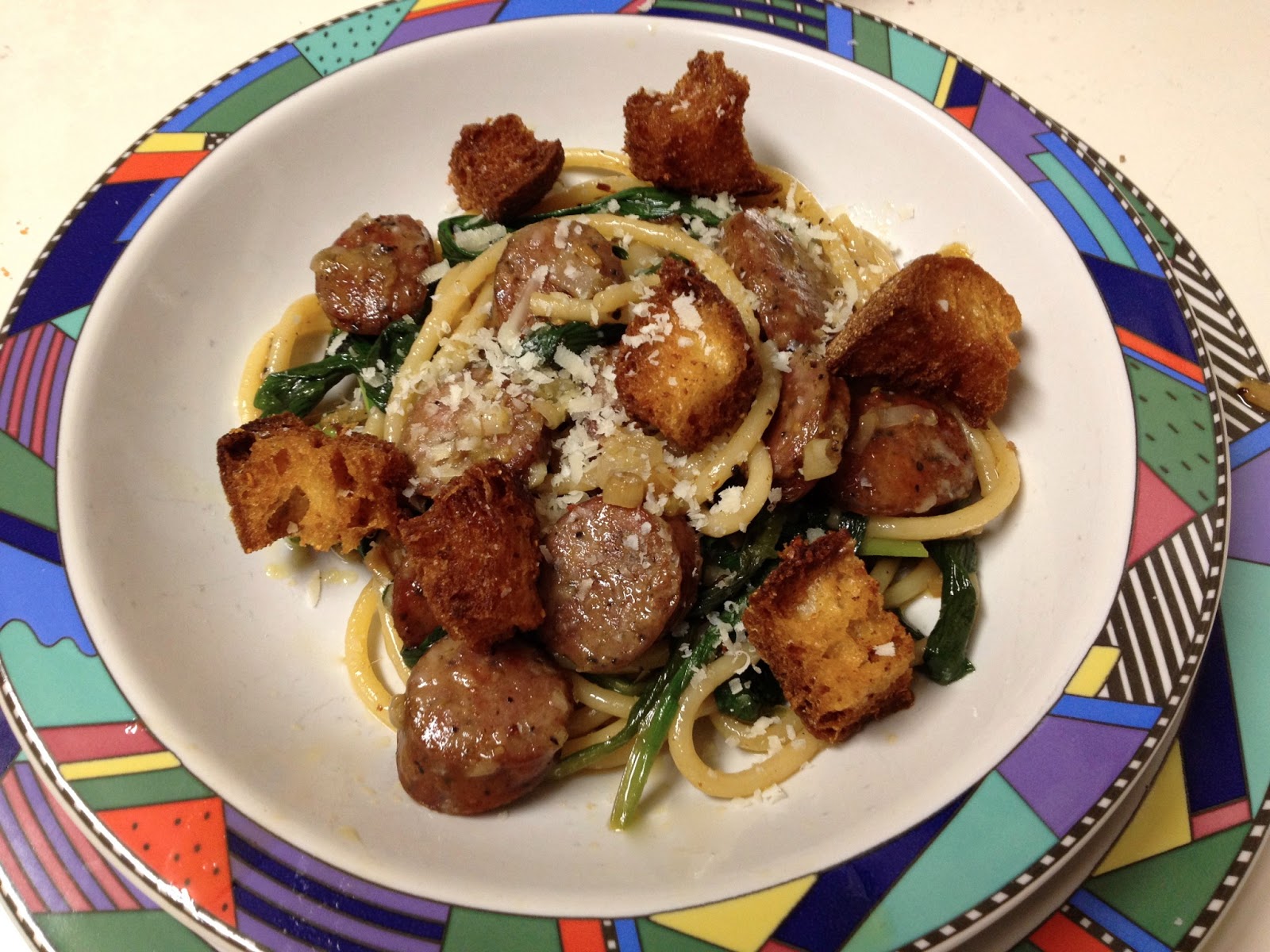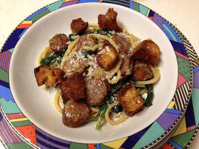 Jacques Larson, whose recipe was my take-off point, is the chef at Wild Olives, (2867 Maybank Highway, John’s Island, S.C. 29455).  Jacques’ recipe introduced me to Pangrattato. Made with days-old bread which is cubed and cooked in olive oil spiced with chiles, garlic and anchovies, it’s a fried crouton.  It looked very good but with my pasta rationed,  I thought the dish needed some more body.  That’s when I latched on two Andouille Chicken Sausages, lonely orphans in the fridge.  They amped up the flavor and the kick and were a great addition, which I’d heartily endorse. However, Andrew and I thought Italian sweet sausage, taken out of its casing and crumbled into bits might have been even better.  Here’s the recipe, which I urge you to try.  It just might hold you over for the run on Asparagus that’s just about to begin.