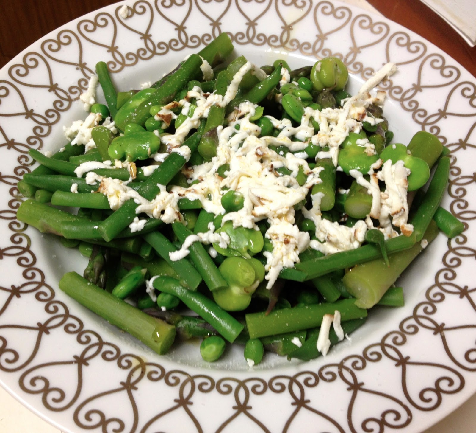 Aside from its appearance in “Silence of the Lambs”, the original Hannibal Lector movie, the Fava Bean is fairly unknown around our house. I now know why. The hairy pod of the Fava conceals surprisingly few ear-shaped beans. And while you might think that retrieving them from their husk would be all they’d require, not so. They have shell over the bean that has to be peeled and the bean removed. That seems like an awful lot of work for something that doesn’t pack a lot of flavor. The second go ‘round I opted for Edaname instead, the nicely packaged version where everything’s been peeled for you. The two are amazingly similar from a nutritional standpoint. But the edaname actually outpaces the Fava for both protein and fiber. I’ve used both haricots verts and good old string beans and both work. I highly recommend keeping the petits pois in the recipe, they add a sweetness that’s a good counterpoint to the asparagus. Finally, the chili oil is very much a matter of taste. The minimal quantity in the original recipe didn’t bring much to the party. So the second go round, I upped the amount of red chile pepper flakes. The dish was served warm, the leftovers, cold. Either way it was a total winner. Here’s the recipe: