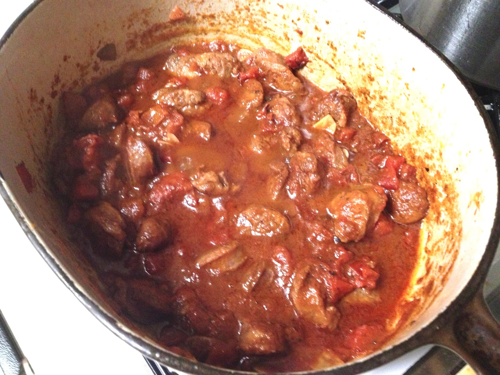 Leave any fat from the sausages in the pot. Return the sliced sausage to the pot and, on top of the stove, brown the sausage slices stirring frequently until they are brown. Add the sliced garlic and cook for 1 minute. Add the tomatoes and their juices, the dry red wine, the tomato paste, 2 teaspoons of salt and 1 teaspoon of freshly-ground black pepper. Let the mixture simmer over low heat while you make the pasta.