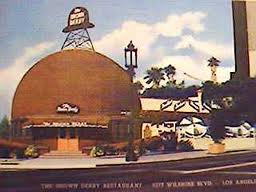 The Brown Derby had a guest list that read like a Who’s Who in Hollywood.  Clark Gable proposed to Carol Lombard there. Rival gossip columnists Hedda Hopper and Louella Parsons held court there.  And the place ‘starred’ in an a never-to-be forgotten episode of “I Love Lucy” with William Holden and Eve Arden as foils for Lucille Ball’s comedy.  It was actually a chain of restaurants with branches in Hollywood, Beverly Hills and Los Feliz but the original Wilshire Boulevard Brown Derby was the best remembered.  It was hard to forget as the restaurants were shaped like a Brown Derby Hat.
