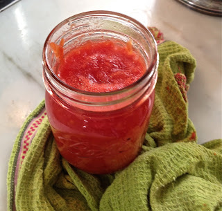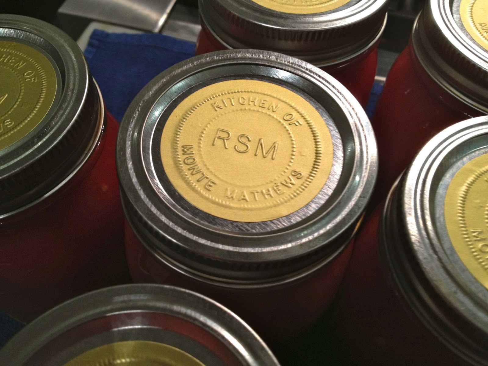 tomatoes on the bottom, the skin slips off, the bruises often disappear and when they don’t a paring knife makes quick work of both bruised flesh and the tough core. Prepping the tomatoes for the next step involves halving the peeled tomato and then releasing the seeds and the jelly around them. This the fun kind of messy work—crushing the tomatoes with your hands, ripping off any tough or un-ripened bits until you have a very soupy tomato puree. From there it’s into a big stock pot where the tomatoes are heated and a potato masher is used, according to the Times, so that the tomatoes and their juice will not separate in the jar. Once the tomatoes have cooked, you put them in jars with just a teaspoon of salt per quart and most essentially, bottled lemon juice is added. The lemon juice assures that the pH level of the sauce is low enough to avoid botulism, something I am quite scares the dickens out of all home canners. You can also use citric acid but I had Real Lemon Juice on hand and was delighted to find a use for it. Without further ado, here is the recipe: