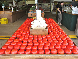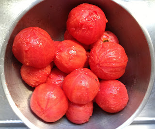 Every fall something primal comes over me and I feel the need to can or ‘put up’ produce for the coming winter. This likely goes back to visions of my paternal grandmother, a country girl from Ontario, who despite having strayed a long way from the country, nevertheless took it upon herself to can up a storm every September. She made all kinds of pickles, but the one fresh vegetable that remains in my memory were her pints of Tomato Sauce. To be honest, I never quite figured out how she used the Tomato Sauce. We were as Anglo as you could get: even Spaghetti sauce was a novelty in our household and in hers, un-heard-of. Perhaps Nana made tomato soup. But she certainly never attempted a gumbo or anything remotely foreign. Fast forward to my kitchen last weekend. I was back in Nana country for a few hours and in my head danced visions of winter curries and pasta sauces and cioppinos. And all it took was a little time and some glorious tomatoes from the farm stand down the road.