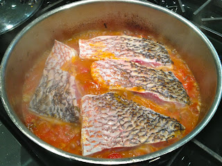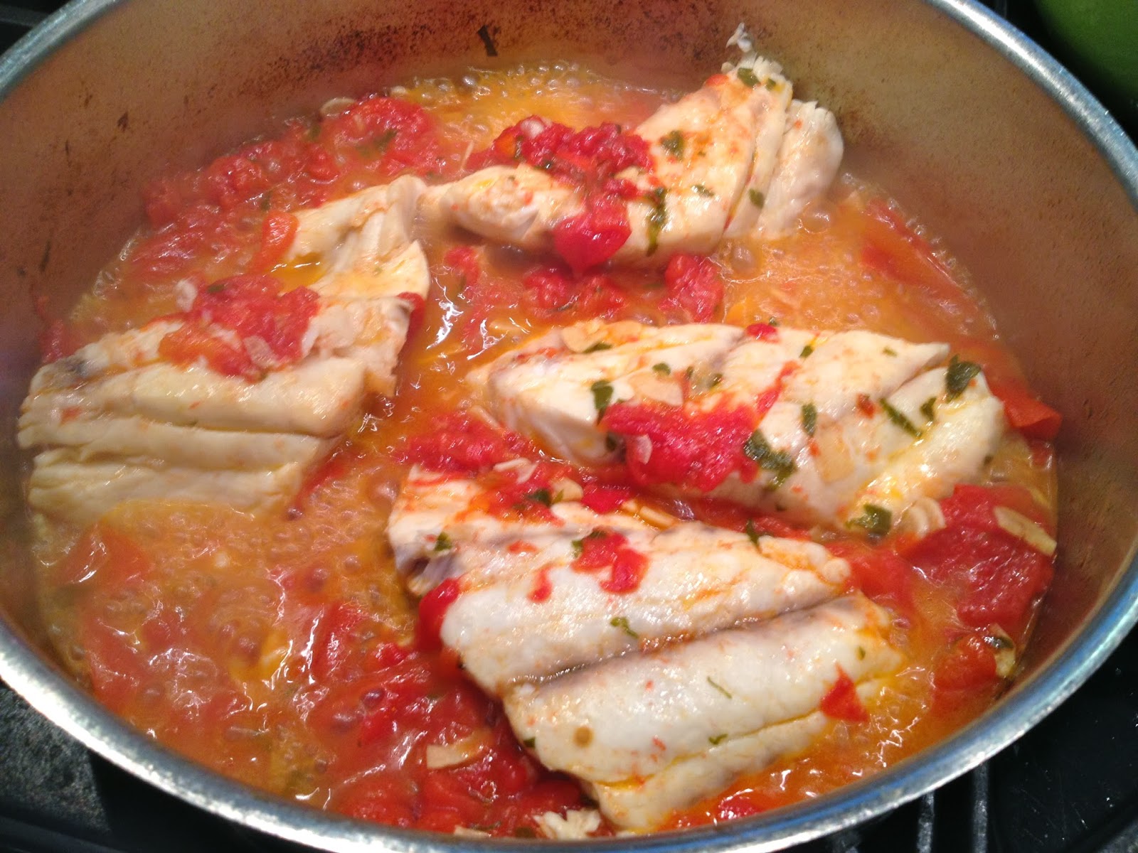 2. Choose a saute pan in which the fish fillets can be subsequently fit flat without overlapping. Put in the water, garlic, chopped tomatoes, parsley, chili pepper, olive oil, and salt. Cover the pan, turn the heat to medium, for 45 minutes.