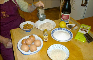 6 large eggs (of which all the yokes and 5 of the whites will be used). 30 gms (about 1 oz, or six squares, not critical) of good quality dark cooking chocolate, which adds colour, more than flavour.