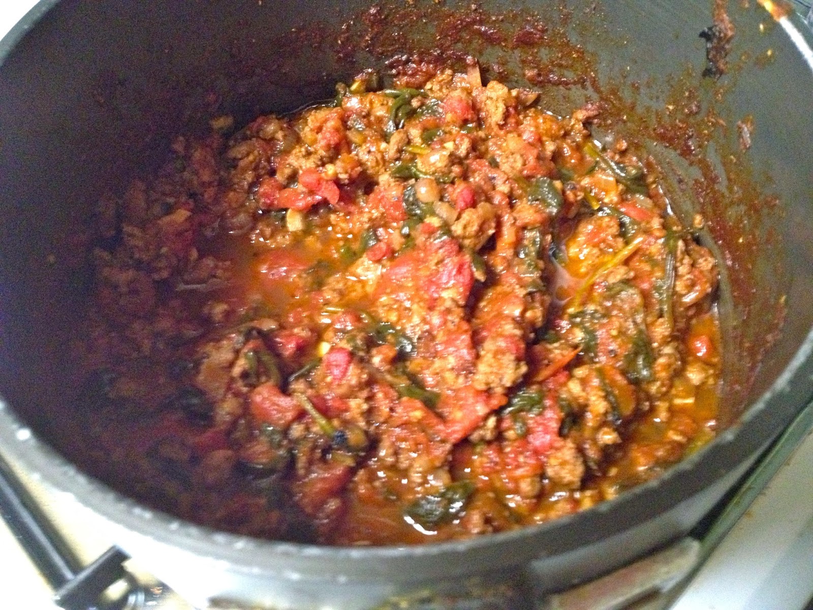 As often is the case, family recipes tend to feed multitudes. This one proudly boasted of making 1 pound of ground lamb serve 8-10 people. This makes it a very budget conscious selection. The recipe is padded with ingredients besides the single pound of lamb; 42 ounces of Tomatoes are combined with onions, spinach and then the finished dish is sprinkled with kalamata olives and crumbled Feta Cheese. This final topping works particularly well in households like mine where one of us never touches an olive and is not all that crazy about Feta. You just set those to one side and have each individual choose to add them at will. It’s a very substantial dish and has that particular advantage of using only two pots in its preparation, making clean-up a snap. As there were just two of us, I had plenty leftover. Enough to freeze and wait a week until, slammed with yet more snow and cold, we were ready for more warming lamb.