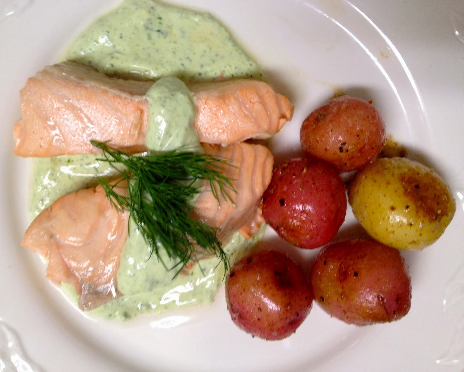 I had not poached salmon for quite a while, choosing instead to broil or pan saute the fish. I had almost completely forgotten how tender poached salmon can be—blissfully so in this case. Add the minted yogurt sauce and you have a combination of sweet salmon and tart sauce. The mint has the added bonus of perfuming the sauce. The simple potatoes are something I make often. Into a small cast iron pot goes about a cup of little reds and yukons per person, a knob of butter and a few turns of the salt and pepper grinders and in about a half hour, after a 30 minute stint in a 375 degree oven, you have perfectly cooked, tender little morsels to pop into your mouth. This is an excellent weeknight dinner as it takes no time at all and, if you feel the way I do about it, it melts away the tensions of the day. Zen, in case you’ve forgotten, is the Buddhist practice of meditation and intuition. And when I can find that in my kitchen, I’m all for it.
