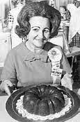 In this country, the credit for popularizing the Bund Cake goes to a pair of Minnesota brothers, the Dalquists, who owned a cookware enterprise called “Nordic Ware” and to an entrant in the annual Pillsbury Bake-Off.  First the brothers: At the request of two ladies of the Hadassah in Minneapolis, the Dalquists were asked if they could produce a modern version of the traditional cast iron Gugelhupf pan.  They produced a cast aluminum version and in order to trademark it added the “T” to the Bund.  The first Bundt cake pans were a bust in sales.  Then, a woman named Ella Helfrich came in second at the 1966 Pillsbury Bakeoff with her recipe for a Bundt cake called “Tunnel of Fudge”.  Ms. Helfrich walked off with the $5000. Prize. But the real winners were the Dalquist Brothers.  There were more than 200,000 requests for Bundt pans and soon the pan itself surpassed the Jell-O mold as the most sold pan in the US.  Then in the 70s, Pillsbury licensed the name “Bundt” from Nordic Ware and began selling a whole series of Bundt Cake mixes.