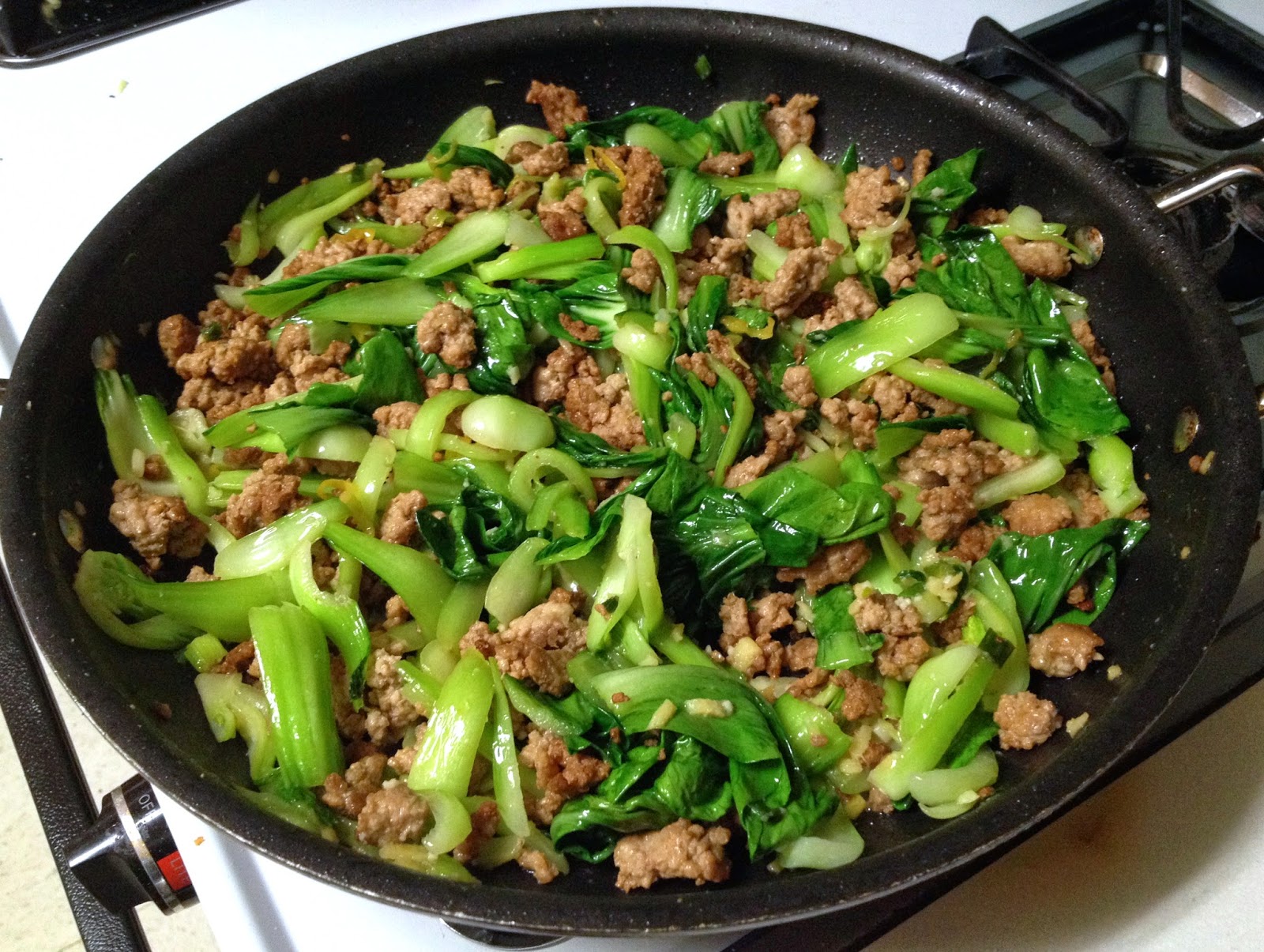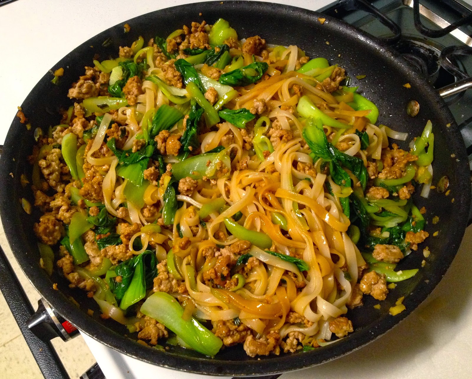 What Chef Tanis did was to take the essence of the meat filling with its savory pork and tons of ginger to which he added silky bok choy. He didn’t make it into a dumpling at all. Instead he added rice noodles to substitute for the wantons. These noodles, often found in Pad Thai, added texture to the dish and, for all those concerned about it, made the recipe gluten free. It’s a very flexible recipe so if you’d care to swap out the ground pork for ground turkey or chicken, be his guest. You could also use kale or Napa cabbage in lieu of the bok choy. I keep a fairly good-sized Asian Pantry as I love to stir-fry. But if yours doesn’t extend to Chinese Black Vinegar, which is sprinkled over the sliced ginger, Chef Tanis says you can either leave it out or substitute balsamic vinegar which, although sweeter, will have a similar caramel notes to play off the ginger. It takes all of 45 minutes to put together, probably not for the busiest night of the week but perfect when you can spare an extra 15 minutes or so. Here is the recipe: