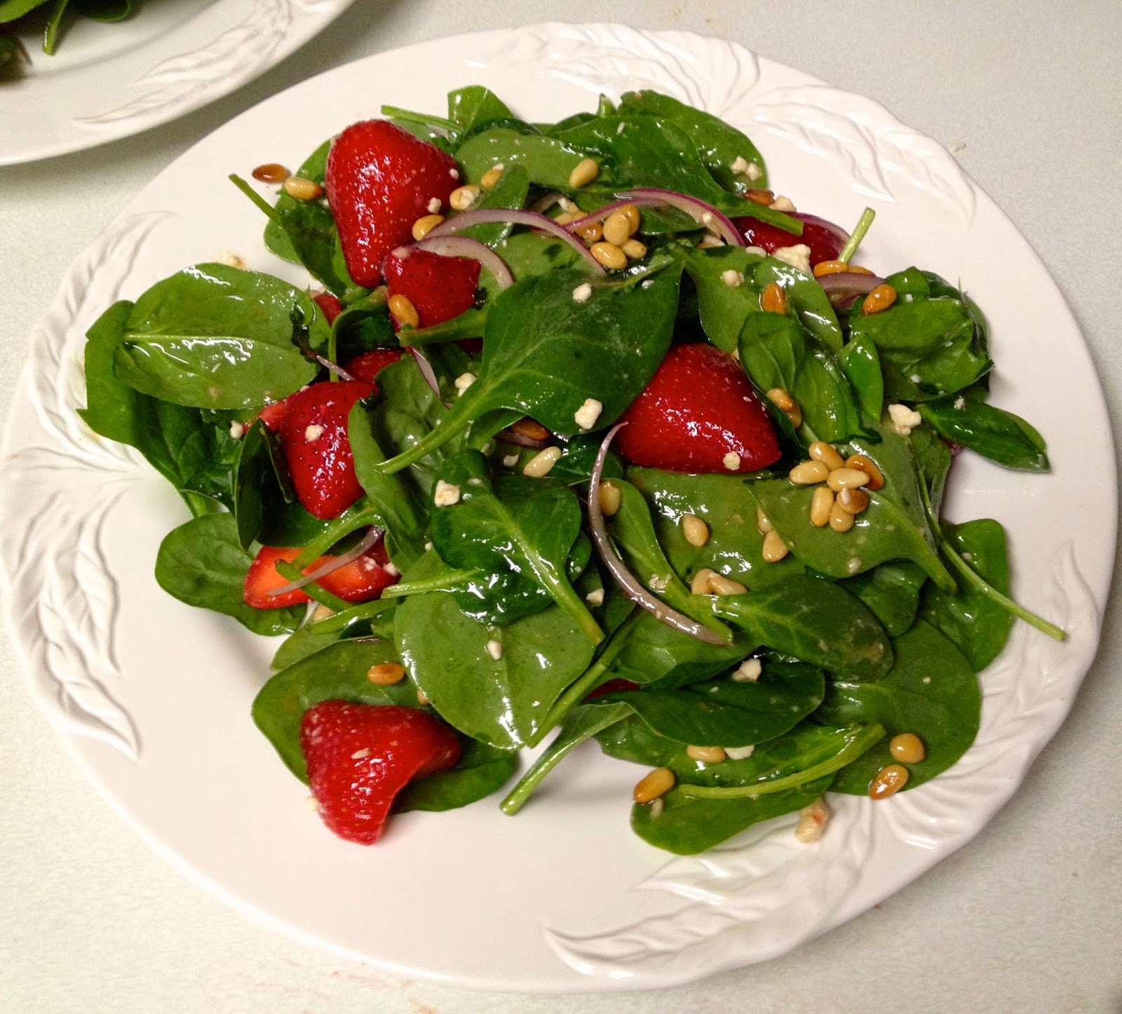 (http://chewingthefat.us.com/2013/06/joanne-changs-balsamic-strawberry.html). But Andrew was in Texas and I am not the baker he is. Instead I searched for a savory recipe involving strawberries. I landed on one that’s the amalgamation of several. The main ingredients, baby spinach and strawberries, are combined with the tang of Feta cheese, the slightest bit of red onion and toasted pine nuts for crunch. (You can substitute glazed walnuts for the pine nuts and save a small fortune). To dress the salad, I came upon a recipe from a Chef Luis Protti who cooks at the Pura Vida Spa in Costa Rica. It’s a very simple vinaigrette with that gets its sweetness from brown sugar and for a little oomph,
