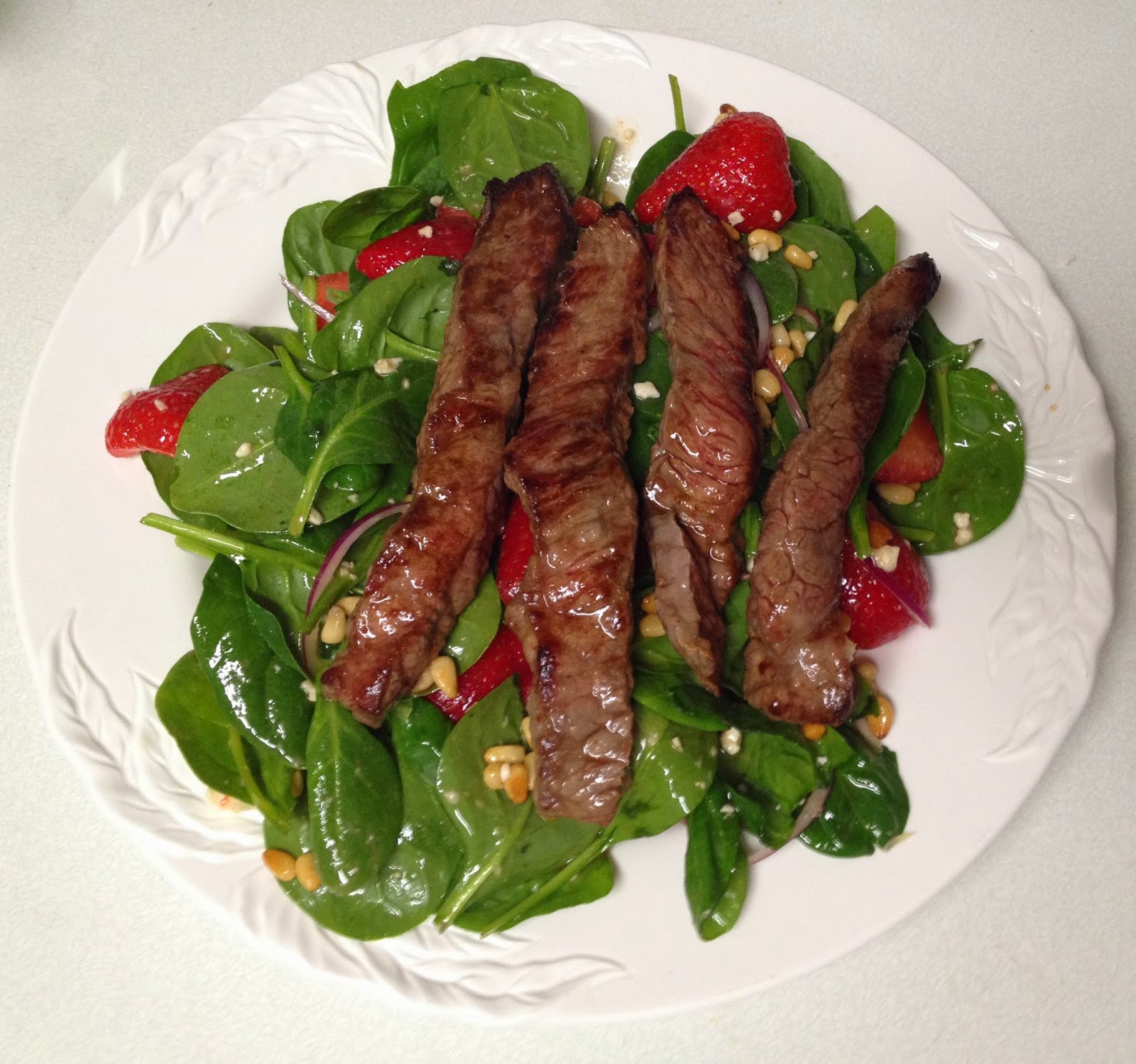 there’s the surprise of a little paprika. Since I served this as a dinner salad, I topped it with seared sirloin strips. I could have just as easily used chicken in the same fashion. But the salad, all by itself, is perfect. And I can hardly wait to make this this summer with our local berries. But that will be some weeks from now even with “Pick Strawberries Day” coming up on the 20th of this month just before “National Strawberries and Cream Day” on the 21st. Here is the recipe: