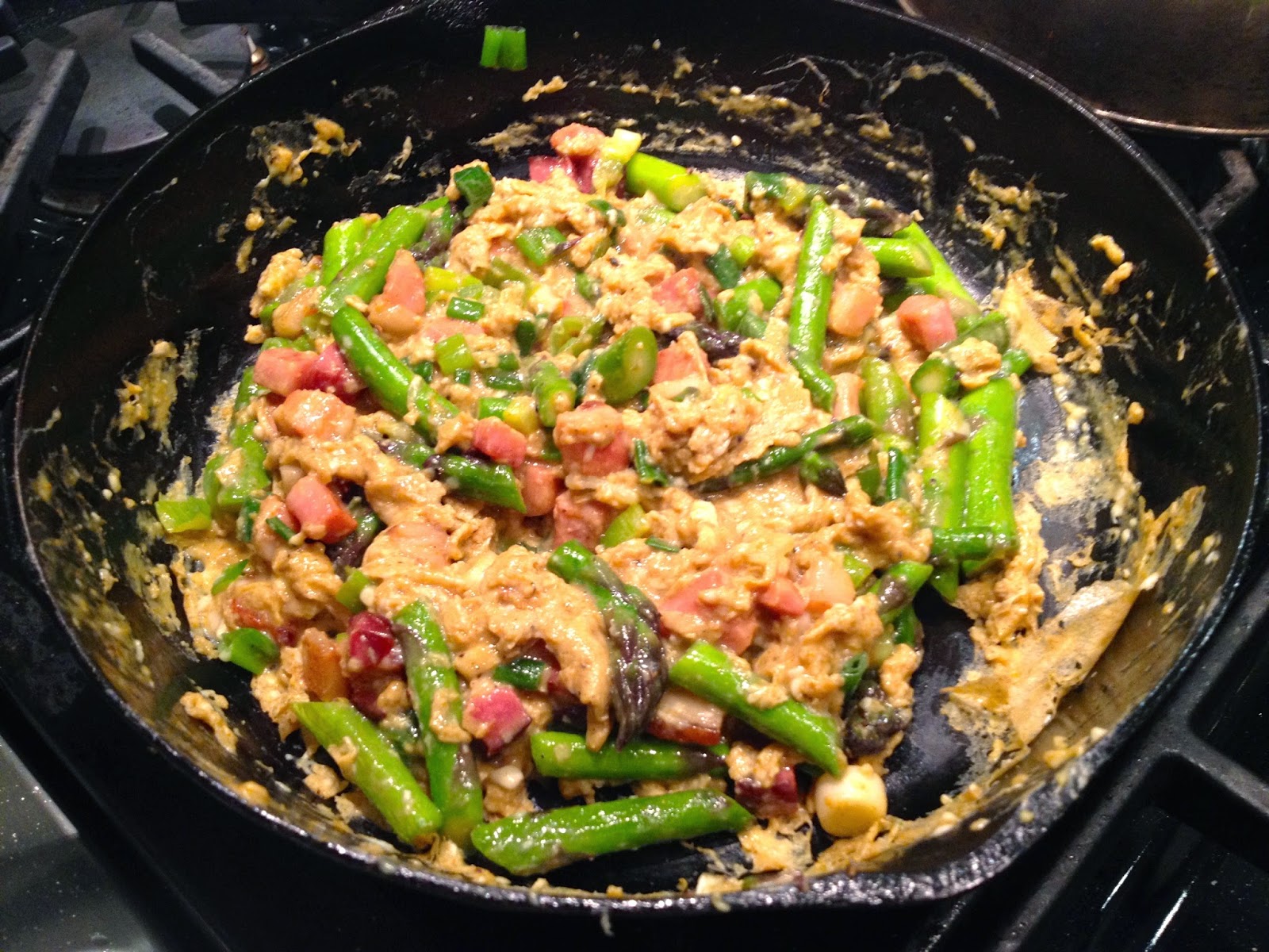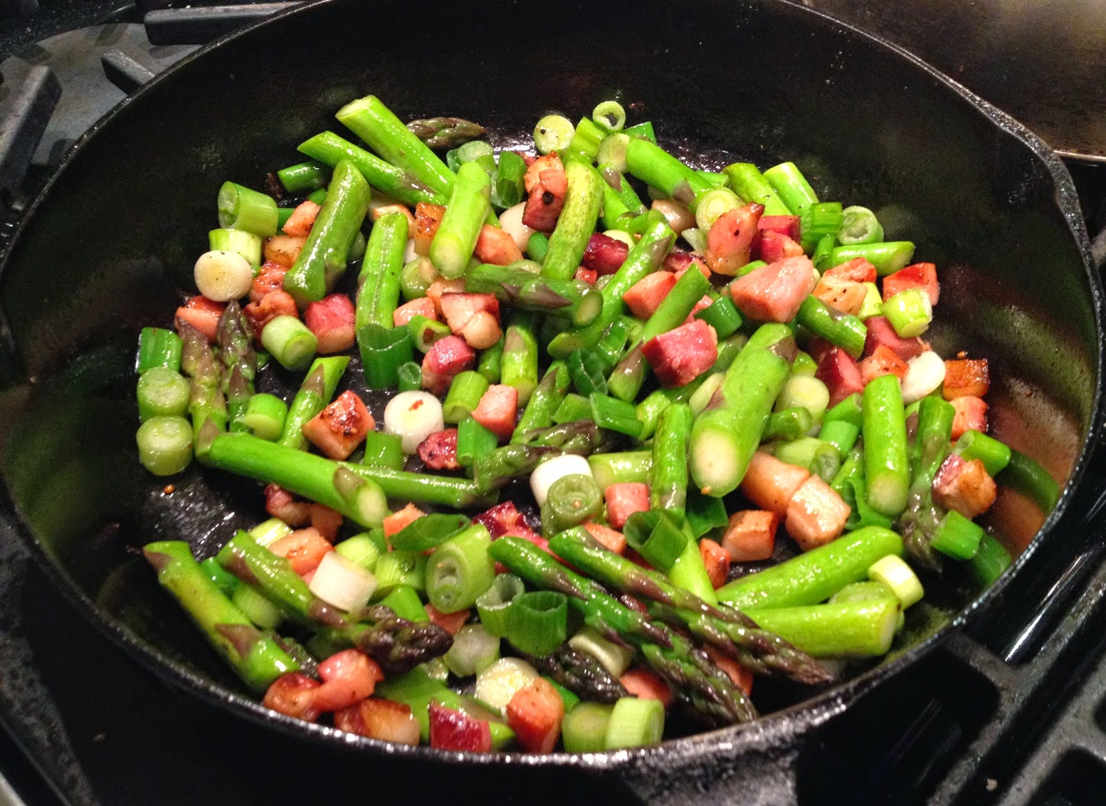 A ‘revuelto’, David Tanis explained in a recent New York Times article in his “City Kitchen” column, is a cousin of a frittata, a simple scrambled egg dish that Spaniards make with cooked vegetables—mushrooms, artichokes, zucchini—but which, in Spring, is most likely to contain wild asparagus. To this, Chef Tanis added chorizo bringing even more Spain to the table. I settled for the domesticated version of asparagus and mostly because I had it on hand, some slab bacon cut into ½ cubes in lieu of the chorizo.  I am sure you could substitute any kind of relatively spicy chicken sausage as well.  The ingredient that also makes this lovely cream-y egg-y dish Spanish is the use of smoked Paprika, which is now so widely available you can find it at Trader Joe’s.   And of course, you can up the Spanish ante by using Spanish Olive Oil which is fruitier than it’s Italian or Greek cousins which tend to be more pepper-y.  Whatever you use, this is an easy recipe whose only drawback is that I wish it photographed better—even the New York Times decided to leave it in the pan so it looked more appealing.  Here is the recipe. This is for four people. I halved the recipe for the two of us without any difficulty at all.