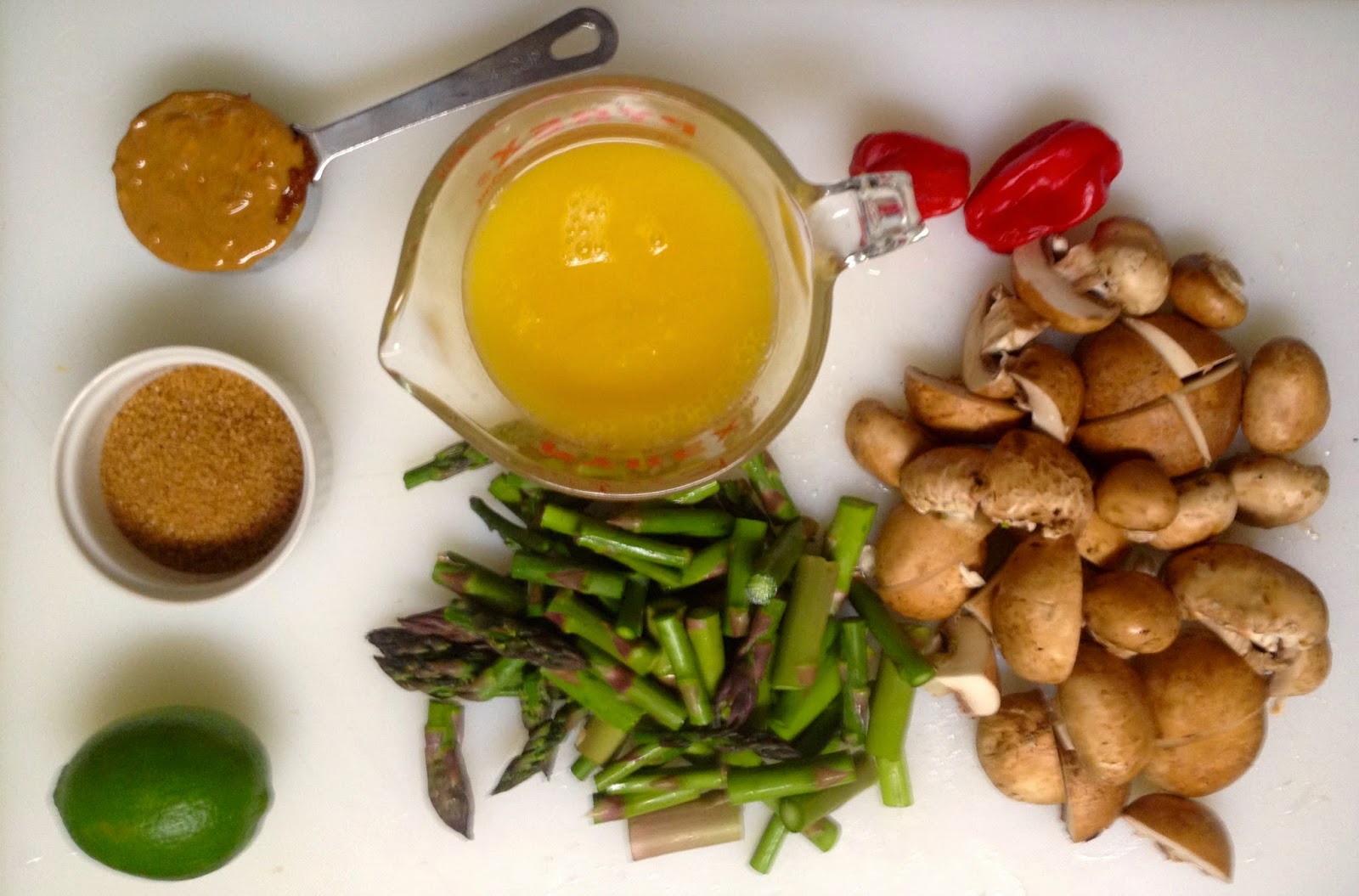 There are plenty of ways to incorporate asparagus in to a main course so that it’s an integral part of the recipe and not just the beautiful side dish it generally is.   In my search for something different, I came across a quick curry that did just that.  Now curry may not sound like Spring to you but in Malaysia, where this curry hails from and where the seasonal changes come and go with very little change in temperature, curry is a ‘year round staple.  The theory is that hot, spicy foods stimulate the circulation and raise the body temperature.   The rise in body temperature is then supposed to make you feel cooler by diminishing the difference between you and the surrounding air.  At the moment, I can’t see any real need to cool off as we’re barely warming up—at least on the East Coast.  In fact, there are still nights when you might appreciate a little heat.   The recipe for Penang Curry with Chicken, Asparagus and Mushrooms from Fine Cooking Magazine calls for, need I tell you, Penang Curry.  It also called for a half dozen frozen lime leaves!  While I live in a neighborhood where just about anything you can put in your mouth is sold, neither Penang Curry nor frozen lime leaves were not to be found.  However, it was easy to create this peanut-laced concoction substituting red curry paste mixed with some crunch peanut butter.   As to the lime leaves, lime zest made a perfect substitute.  The other foundation here is Coconut milk. I opted for the low calorie or “Lite” version which is more liquid-y and really needs to cook down a bit.  Finally, I would serve this on rice which will sop up the wonderfully complex sauce and absorb some of the heat.  Here is the recipe: