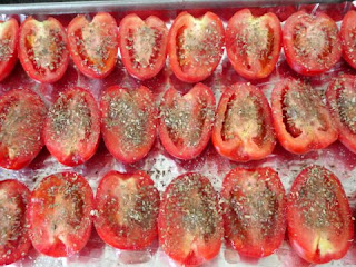Core the tomatoes and then slice them across (not through the stem) in 1/2 inch-thick slices. Arrange the slices in a single layer on a sheet pan. Drizzle the tomatoes with the olive oil and sprinkle with the oregano, 1 1/2 teaspoons salt, and the pepper.