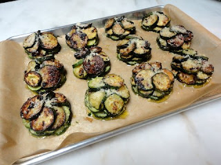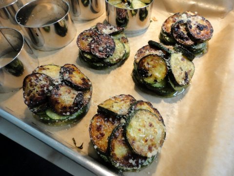 On prepared baking sheet, overlap enough of the zucchini to form 4 single-layered, 3-inch rounds. Sprinkle each with 1/2 teaspoon cheese. Repeat with remaining zucchini and cheese to form 4 (4-layered) tortini.