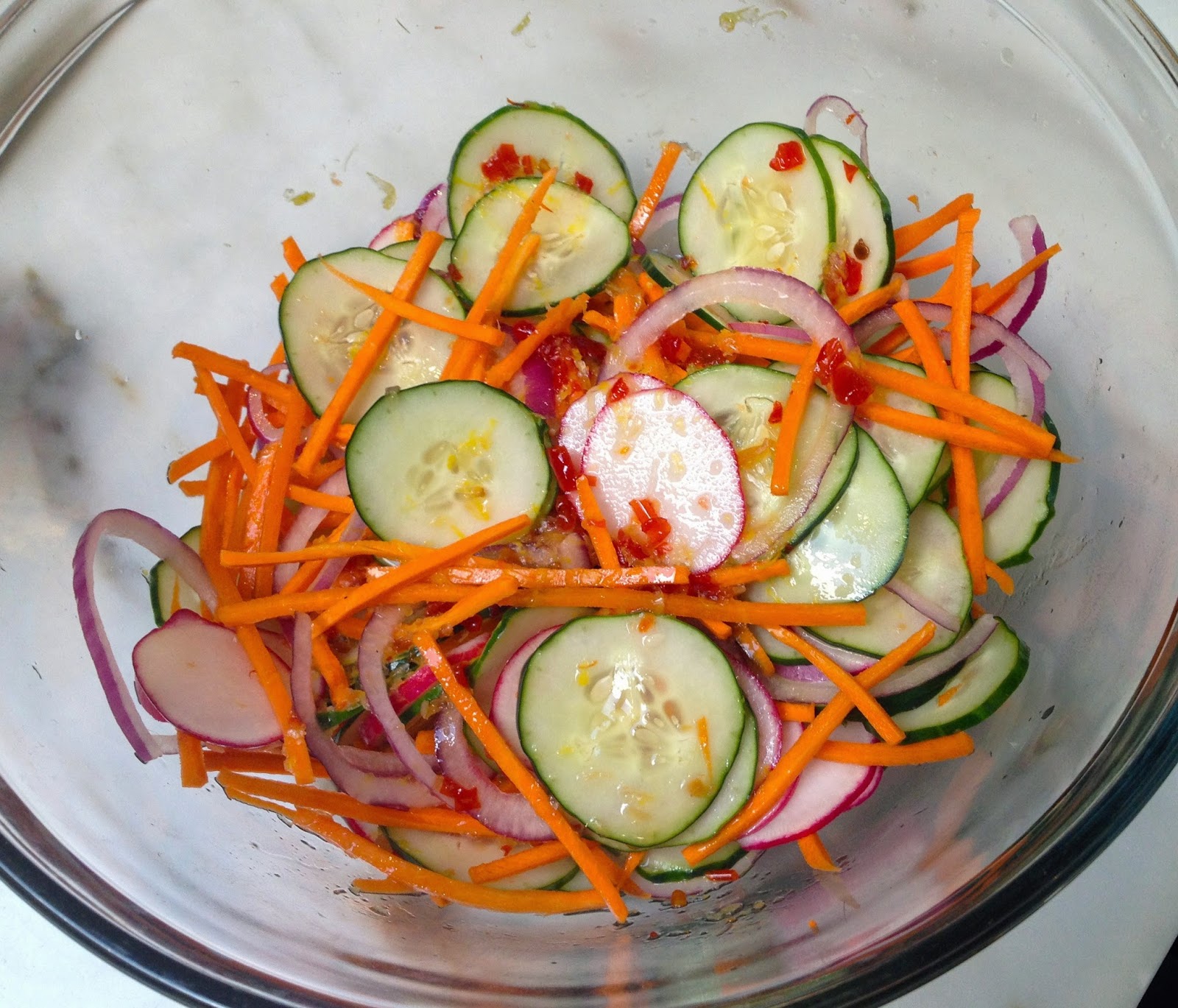 Whisk vinegar, sweet chili sauce, and lemon zest in a medium bowl. Add cucumber, carrot, daikon, and onion and toss; season with salt and pepper. Cover and chill at least 2 hours.