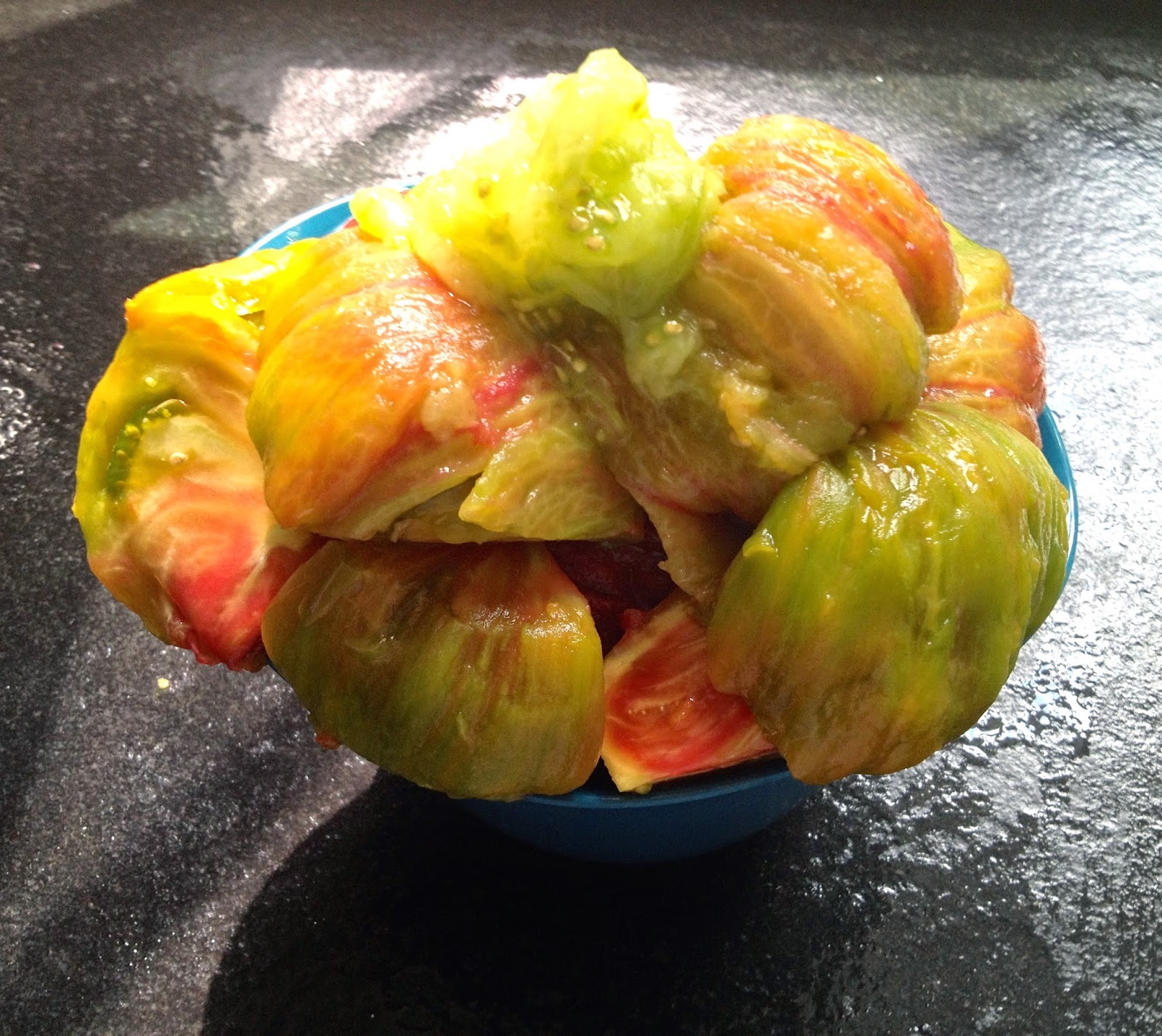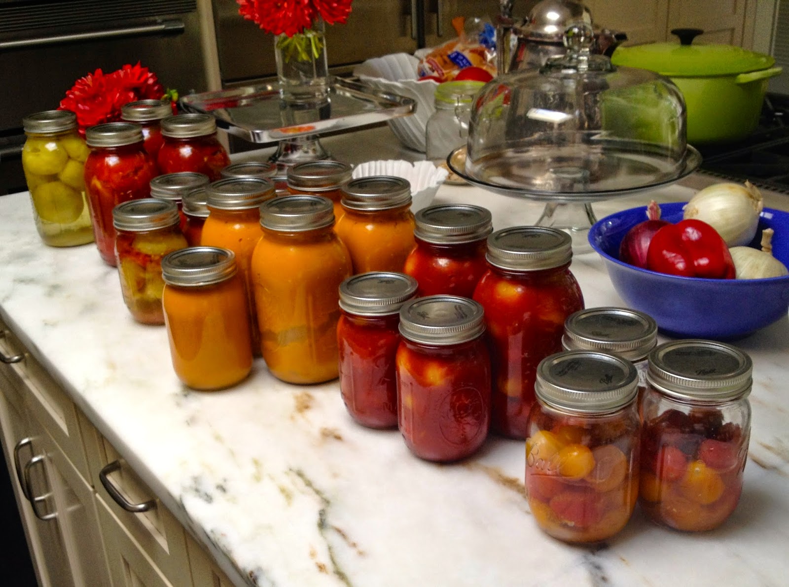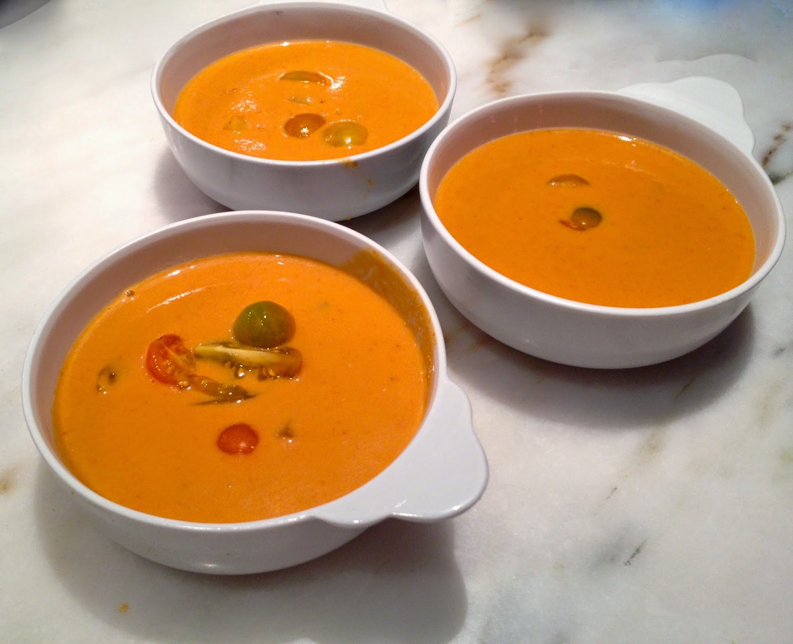 Once the event was over, I was allowed to take home all the heirlooms I could carry. Luckily, we had an empty cooking carrying case that fit the bill. I got the whole lot home and brought out my Home Preservation Bible: “Ball Complete Book of Home Preserving” (2006 Robert Rose Inc.). I could write a whole treatise on the seven variations of canned tomatoes I produced the next day. But I’d suggest buying the book since it’s an invaluable reference guide on ‘putting up’ everything from fruits to salsas to strawberry jam. You can find it here and tell them I sent you. https://www.amazon.com/Ball-Complete-Book-Home-Preserving/dp/0778801314/ref=sr_1_1?ie=UTF8&qid=1409774932&sr=8-1&keywords=Complete+Book+of+Home+Preserving. Meanwhile I want to share the recipe for Heirloom Tomato soup. I did ‘preserve’ mine but you can make up a big batch to serve your guests this weekend and knock their socks off with flavor.