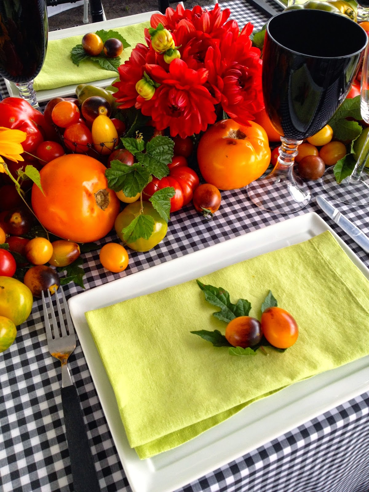 stunning tableware. The food—lobster salad, beef salad, pea and potato salads was prepared by Loaves and Fishes, the outstanding gourmet take-out shop in Sagaponack. Dessert was provided by the one and only Andrew. Now every year we’ve highlighted his “Classic Cookies”. This year he introduced a new almond cookie to the mix. I promise the recipe soon. But I had to give over this post to what the table was all about: Heirloom Tomatoes.