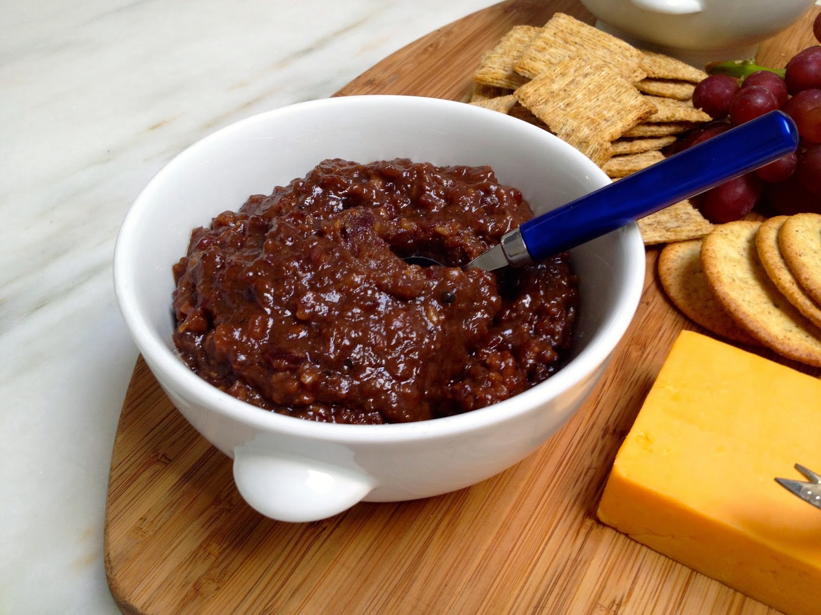 I am always on the look-out for ways to freshen the tried and true. And as the temperature drops in the East, and entertaining moves indoors, Andrew and I love to put out a big platter of cheese and grapes, crackers and biscuits for our guests. If you do it right, it not only stems those pre-dinner pangs of hunger, it looks gorgeous on your table. But our cheese platters inevitably leave us with bits and pieces of various cheeses. There’s leftover Brie, a morsel of hard cheese like Manchego and, if I fish around in the cheese drawer, I can usually come up with some mozzarella that’s too big to throw away or some gruyere that’s too good to do so. I remembered reading about what the French do with the odds and ends and so I went on a quick and found the recipe for Fromage Fort. It’s so thrifty, I could practically hear my mother applauding from heaven. And what a way to meld all these flavors together and get something completely new: A wonderful spreadable cheese, rich in garlic and pepper. So I had a new anchor for our cheese selection. At a recent cocktail party, my clever host, Huey, had simply combined some really good raisins with some toasted walnuts. Nothing could be simpler or more satisfying. But my new discoveries didn’t end there. I was confronted with a recipe I’d been wanting to try since forever. It was for Sweet and Savory Bacon Jam.
