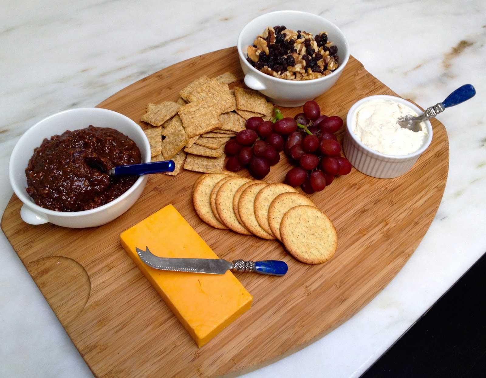 | Top Left: Sweet and Savory Bacon Jam. Center: Toasted Walnuts and Raisins Right: Fromage Fort |