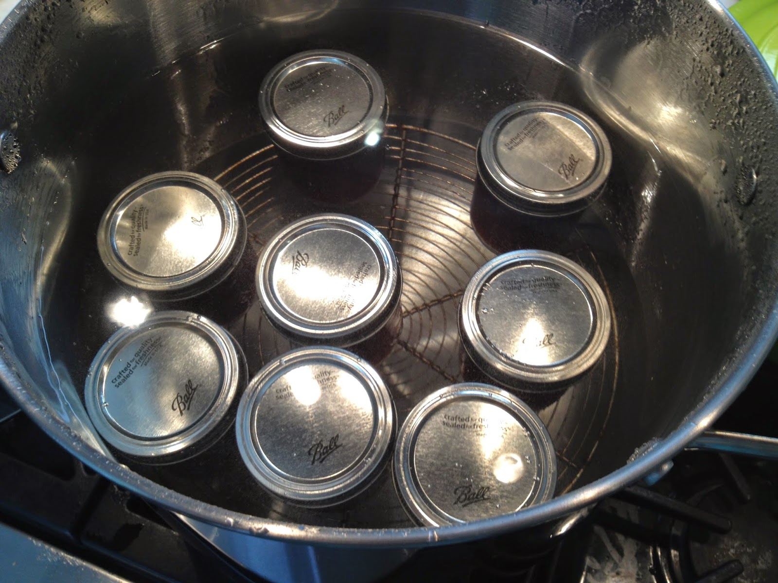4. Prepare boiling water canner. Heat jars in simmering water until ready for use. Do not boil. Wash lids in warm soapy water and set bands aside.