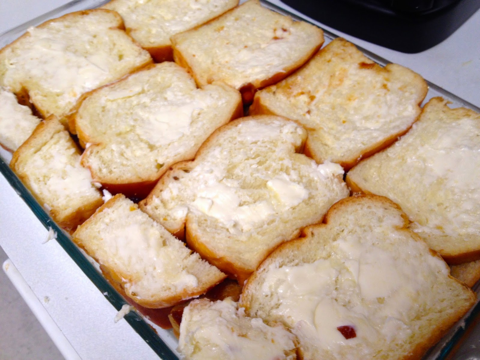 1. Spread softened butter on one side of each bread slice. Arrange 12 bread slices, buttered side down, slightly overlapping in a single layer in a 10 x 15-inch baking dish coated with cooking spray.