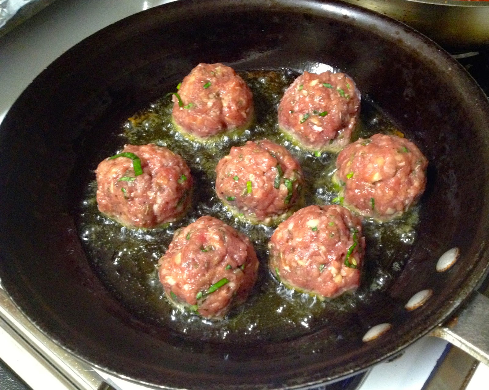 3. In a skillet, heat the oil until shimmering. Working in batches, cook the meatballs over moderately high heat, turning, until nearly cooked through, 7 minutes per batch.