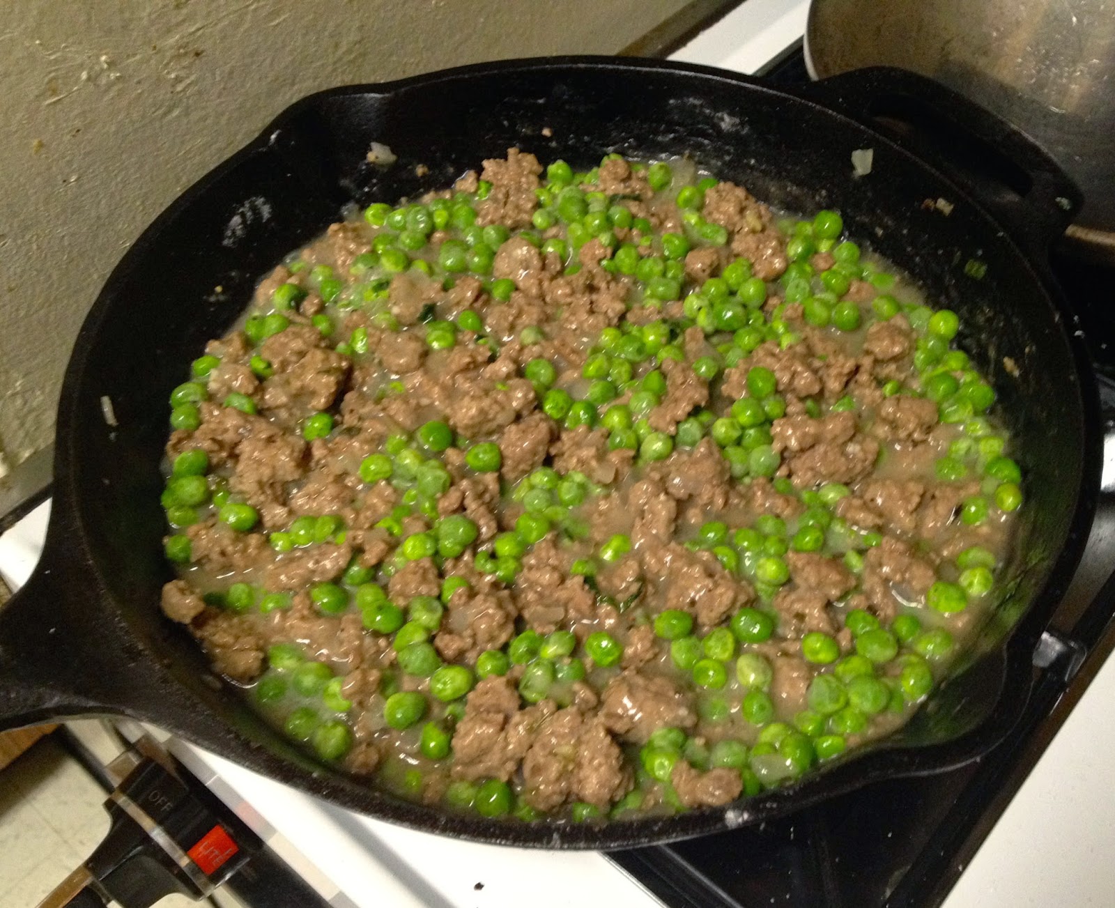 3. Meanwhile, heat a 10 inch cast skillet over moderately high heat. Add the ground lamb, season with salt and pepper and cook, stirring to break up the meat, until browned, about 5 minutes. Drain off all but one tablespoon of fat from the pan. Add the onion and cook, stirring frequently until softened, about 3 minutes. Add the garlic, the chopped mint and the oregano and cook, stirring, for 1 minute. Add the flour and cook over moderate heat, stirring, for 2 minutes. Add the chicken stock, season with salt and pepper and bring to a boil. Stir in the peas and remove from heat.