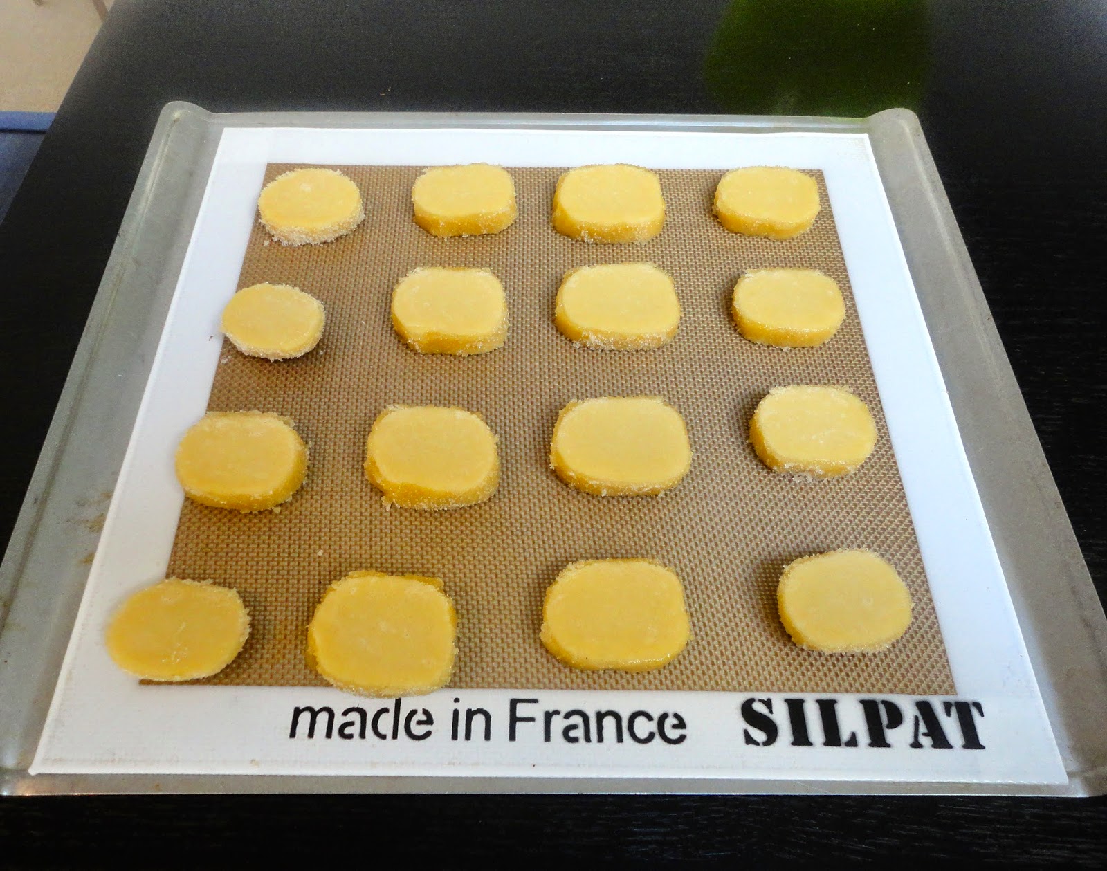 5. To decorate the edges of the sables, whisk the egg yolk until smooth. Place one log of chilled dough on a piece of waxed paper and brush it with yolk (the glue), and then sprinkle the entire surface of the log with sugar. Trim the ends of the roll if they are ragged and slice the log into 1/3-inch-thick cookies.