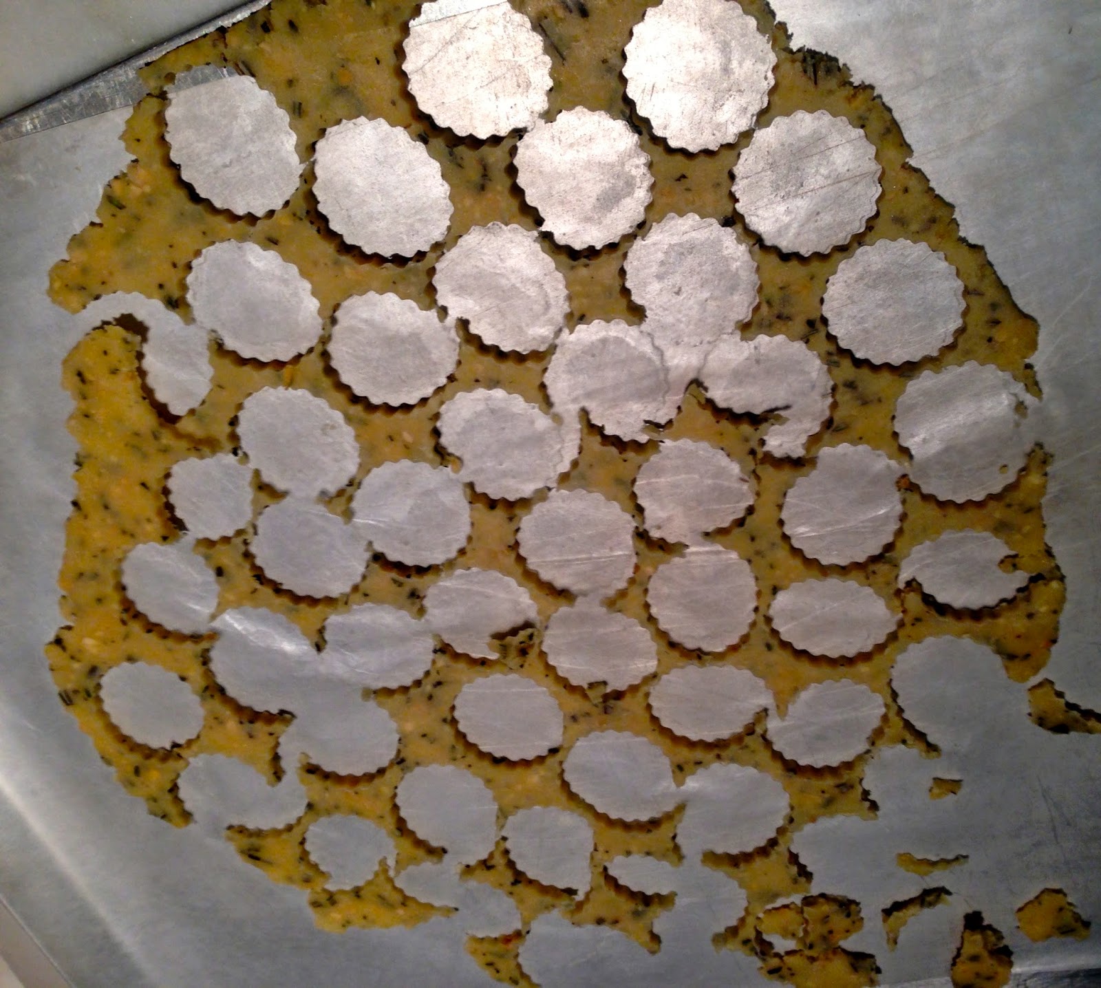 8. Preheat the oven to 350° and line 2 large baking sheets with parchment paper. Working with one piece of dough at a time, peel off the top sheet of wax paper. Using a 1 1/2-inch round cookie cutter, stamp out cookies as close together as possible. Arrange the cookies about 1 inch apart on the prepared baking sheets.
