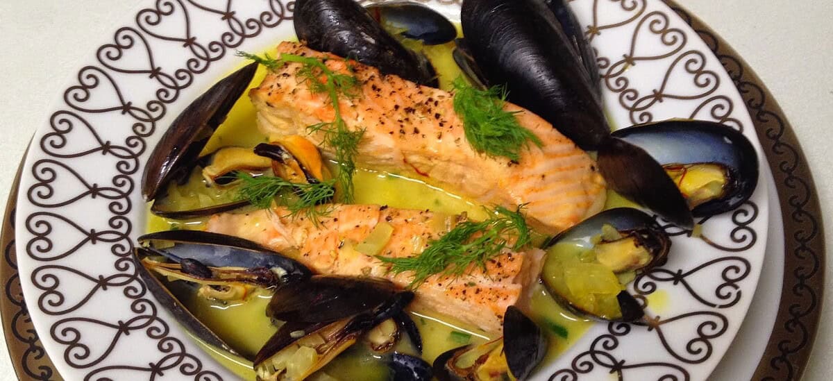 Poached Salmon with Saffron Sauce and Mussels