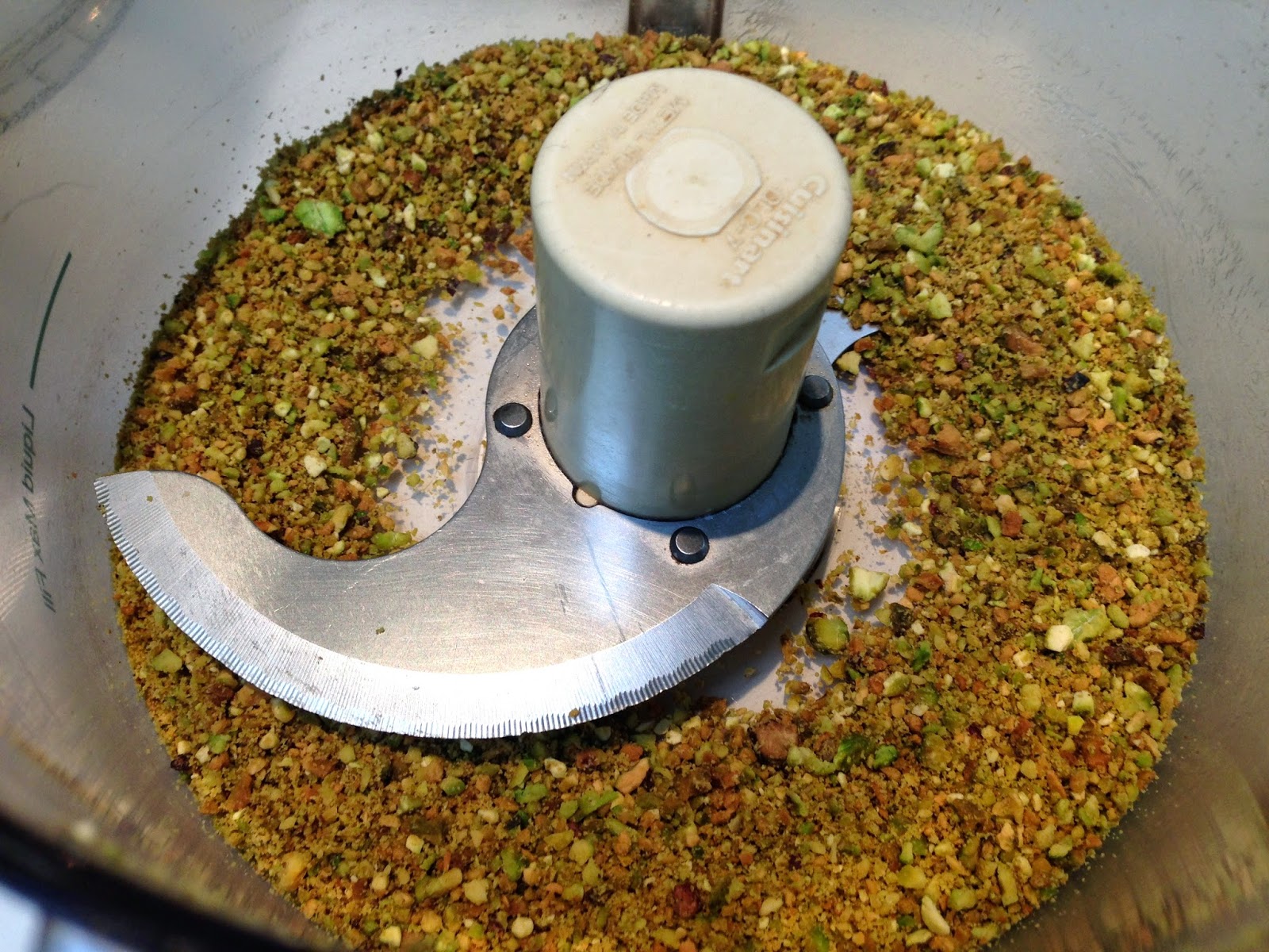 3. In a food processor, pulse the pistachios until finely ground, about five 5 second pulses.