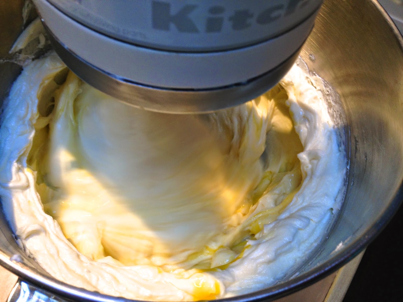 3. In the bowl of a stand mixer fitted with the paddle attachment, combine the cream cheese, sugar and flour. Beat on medium speed until just combined, being careful not to overbeat.  Add the eggs and egg yolk, one at a time, beating well after each addition.  Add the ground pistachios and cream and mix until incorporated.