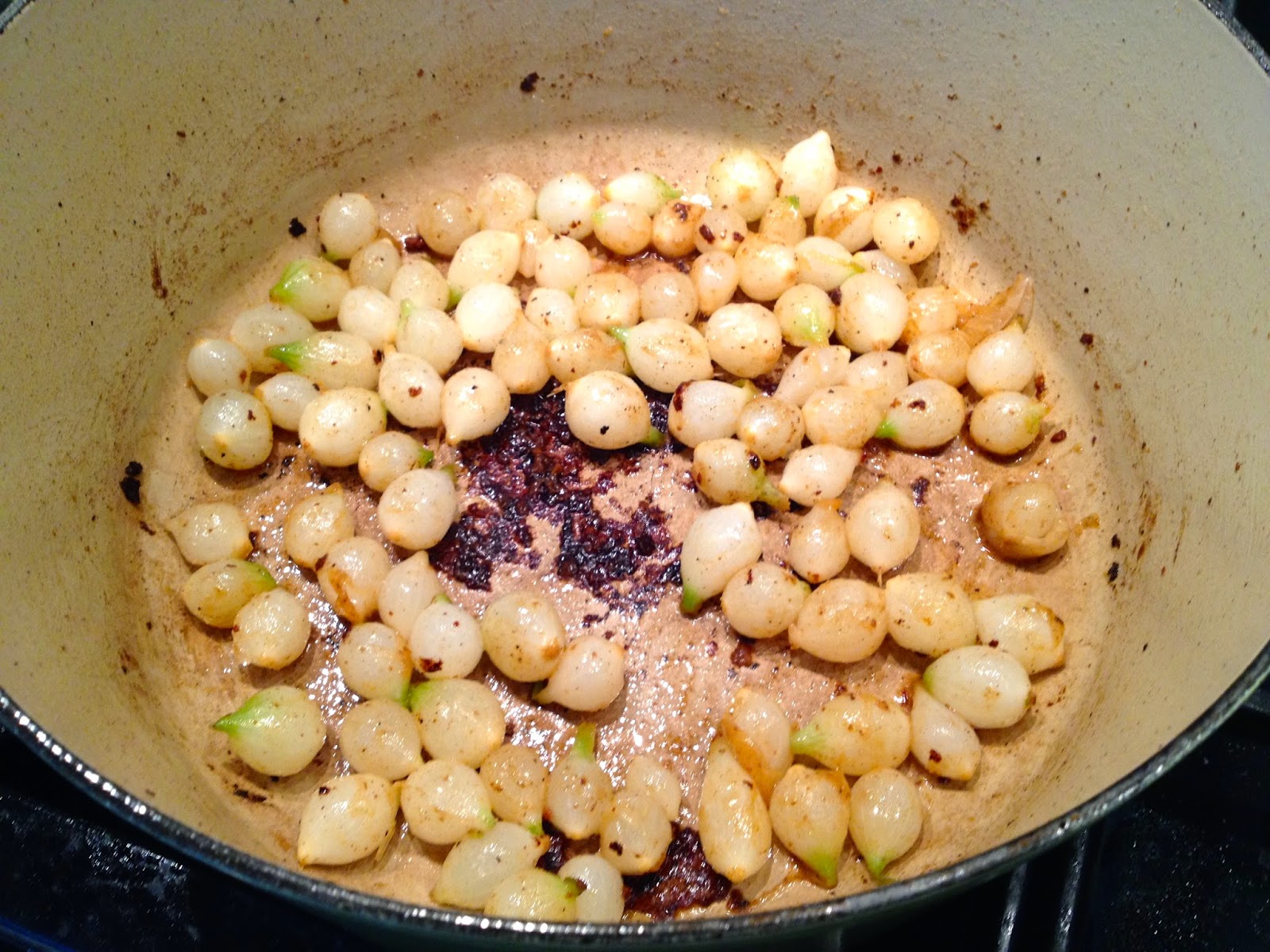 2. Add onions to same pot and cook, stirring occasionally, until golden brown; season with kosher salt and pepper and, using a slotted spoon, transfer to a small bowl.