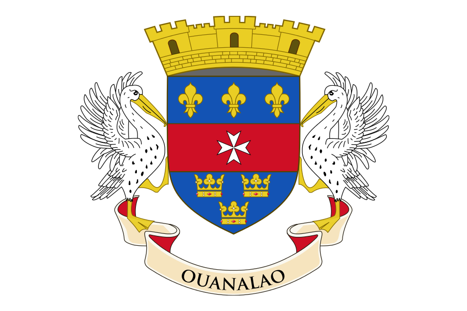 | The Flag of St. Barthelemy. Note the Fleur de Lys for France and the 3 crowns for Sweden Ouanalao is the Carib Indian Name for the island. |