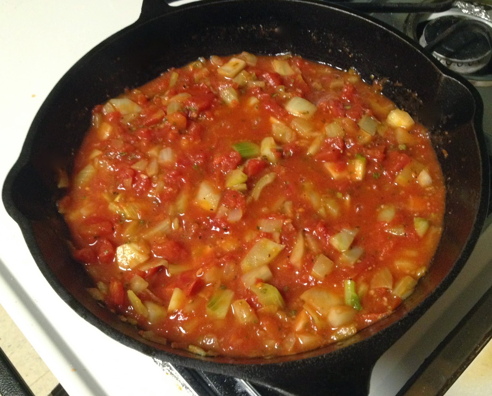 2. Add the tomatoes with the liquid, tomato paste, oregano, Pernod or Ouzo, salt, and pepper to the skillet. Simmer over medium-low heat, stirring occasionally, for 10 to 15 minutes.