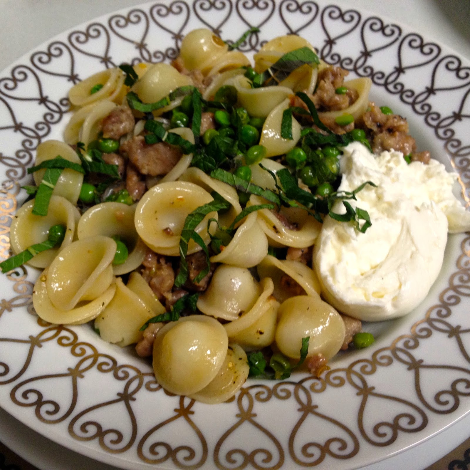 Last week, I went all the way back into the archives for Chewing the Fat. I was astonished to see that an Orecchiette recipe that I posted very early on in the life of the blog has had precisely 40 visits. That is about 1/10th of what an average post should be. The exact dish was a favorite of mine at a restaurant we still go to often. It was so good that for a very long time, I never ordered anything else when we went there. Sadly, there was a change of chef and the Orecchiette suffered immeasurably under his replacement. It’s still on the menu but it is no longer the sumptuous sausage-rich version with its green broccoli rabe accents. Now it’s too liquid-y and the sauce barely clings to the Orecchiette as it once did. So I gave up on it at the restaurant. But today, I started thinking about dinner and the fresh peas and sausage I had on hand and I decided to re-invent the dish as a celebration of Spring flavors. The results were delightful. To refresh your memory, Orecchiette means ‘little ears’ in Italian. The pasta was first made in Puglia, which is the heel of the boot of Italy. An abundance of sunshine makes Puglia the leading producer of Olive Oil in all of Italy. It also makes crops plentiful. The shape of Orecchiette, with its ridged exterior and cup-like bowl, is perfect for capturing sauces and small vegetables like the peas in this recipe. It also of perfect to serve with sautés that begin, of course, with Olive Oil. Here, the sausage is broken down in the sauté pan. To me, the arrival of fresh English peas in the supermarket is another sign of our much-delayed Spring. When I was a very young boy, my grandfather and I would pick peas, which my grandmother inevitably cooked in whole cream adding mint leaves at the end and so I added mint to this recipe. And finally the lush creaminess of burrata cheese is added after the pasta and sauce are assembled, giving the dish a richness which is irresistible. Here is my recipe: