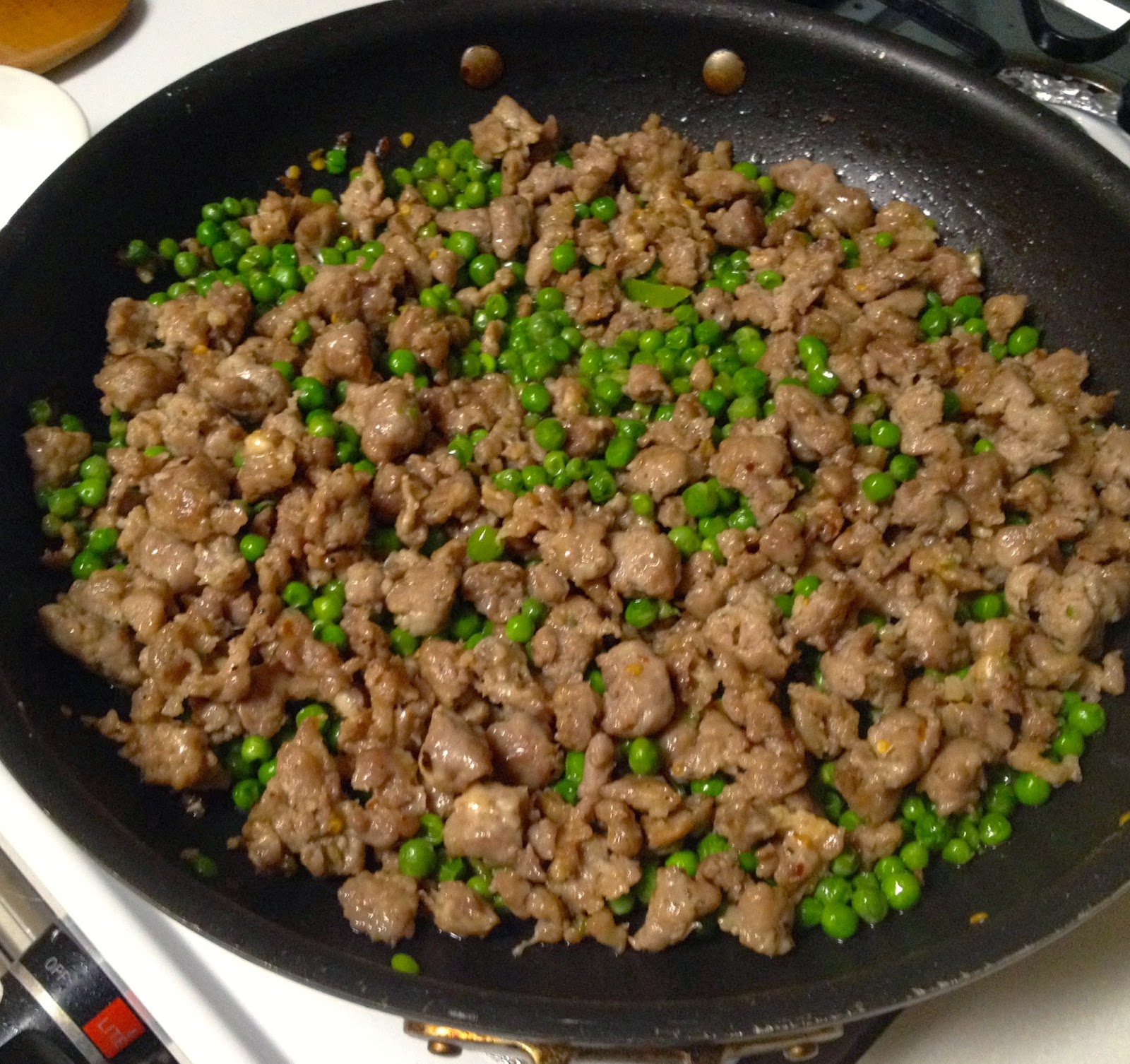 2. Parboil the peas in boiling water for 90 seconds. Drain and then add them to the sausage mixture. Cook until just heated through. Add the grated Parmesan and stir to incorporate it.