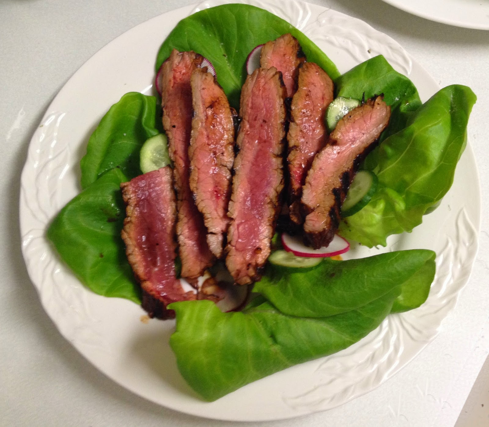 My substitutes for the Korean ingredients are far easier to find. In lieu of Gochujang, I found that Vietnamese Garlic Chili Sauce was a great stand-in and readily available at the supermarket. As to Gochugaru, flying in the face of authenticity, I substituted good old Red Chile Flakes. What I ended up with was a superb marinade that gave the salad an Asian inflection, if not a Korean one. I made this twice: Once with Hanger steak and once with the recommended Flank steak. The Flank steak won out. However I couldn’t help but think that the marinating time made a big difference. I had leftover marinade from version one which allowed me to marinated version two a day in advance. Per the instructions in Ms. Saffitz’s recipe, the taste of the steak gets only gets better if you do. Here is the recipe with both ingredients – the originals and the substitutes. Sauce