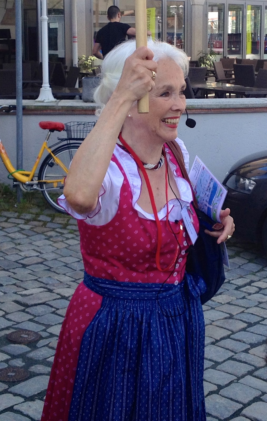 Bavarian dress, holding the “Guidepost”. |
