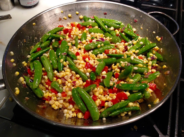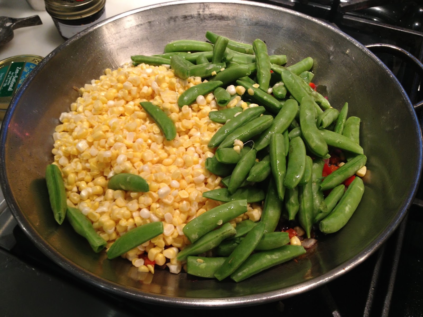 3. Add the corn and the snap peas and cook 2-3 minutes just till warmed through.