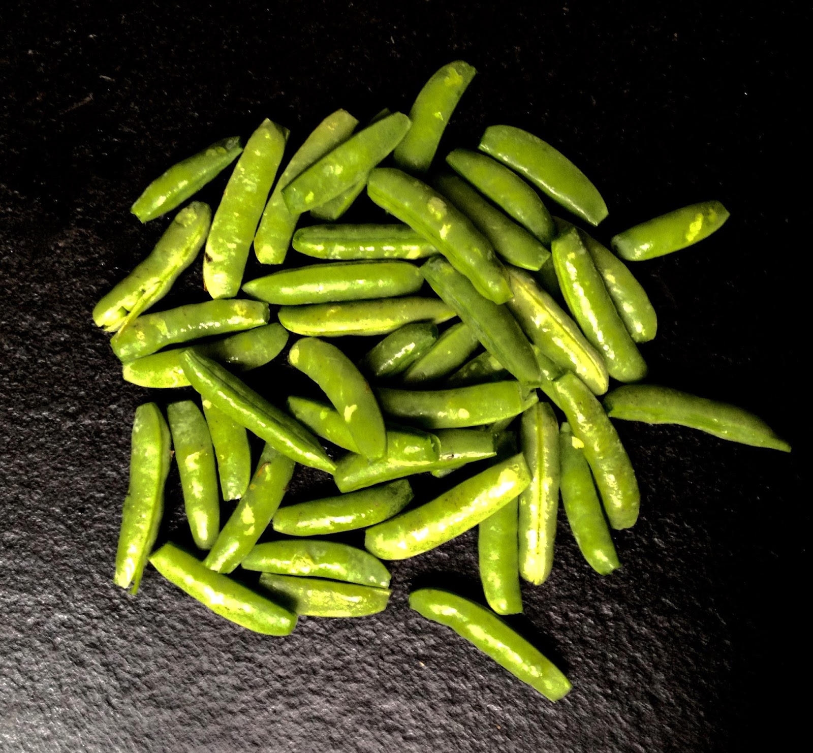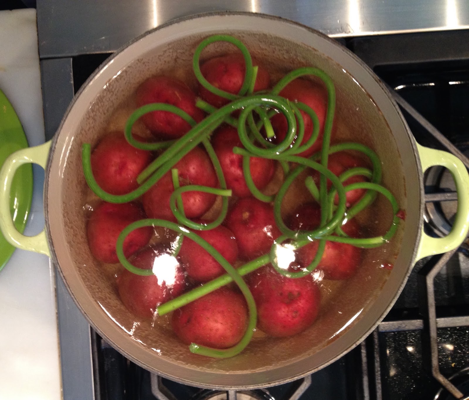 The bud is removed about this time every year to encourage the underground bulb to thicken up. They taste like garlic and can be used in any recipe calling for the ‘stinking rose’. That is what garlic has been called since Greek and Roman times. The reason for the ‘stinking’ part is all too obvious. But why the rose? The plant is actually an allium which is part of the Liliaceae or lily family. So where does the name come from? One possibility is that if you look at garlic from underneath, the bulb does have a slight resemblance to a white rose with the large ends of the cloves forming its petals. It seems to me that that’s a bit of stretch, but it doesn’t take away garlic’s unique contribution to cooking. And this potato salad is a tribute to the relatively mild garlic flavor of the scapes and how they enhance the sweetness of the other key ingredients: potatoes and snow peas.